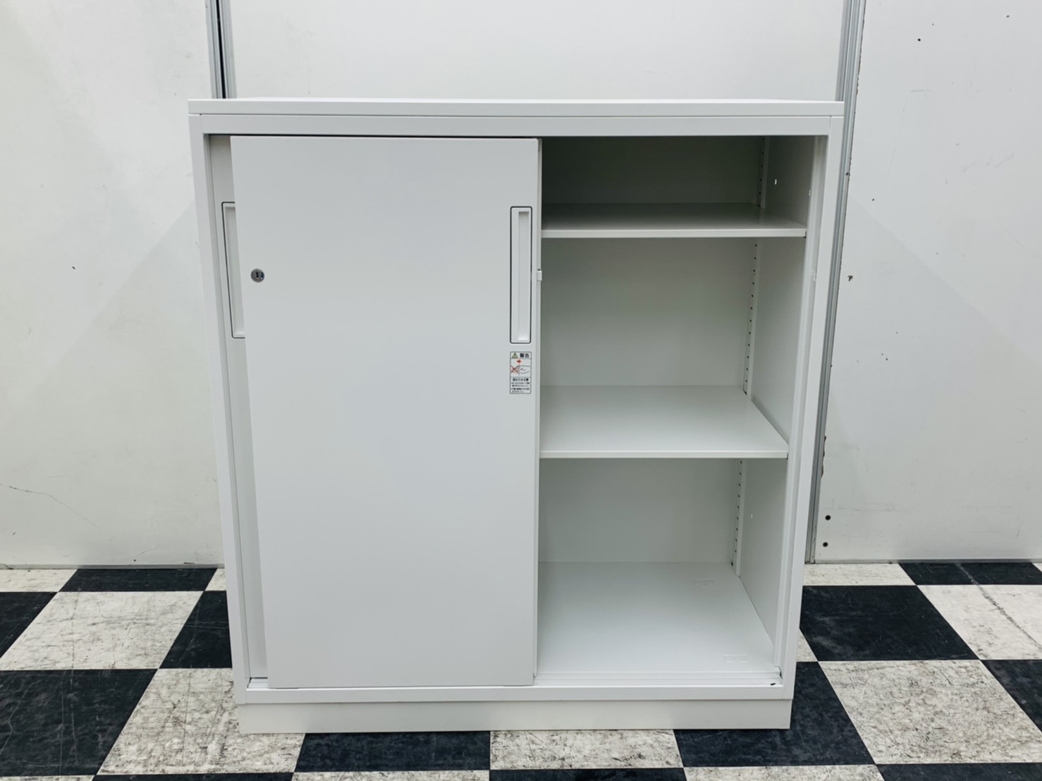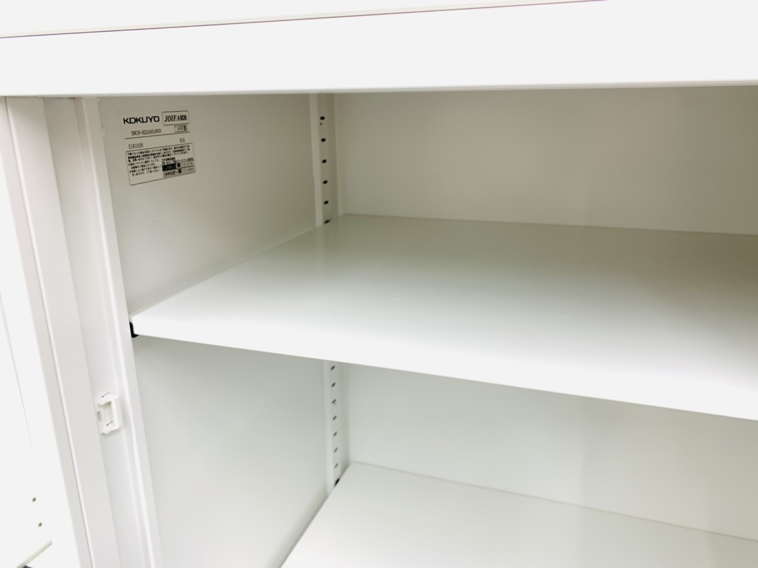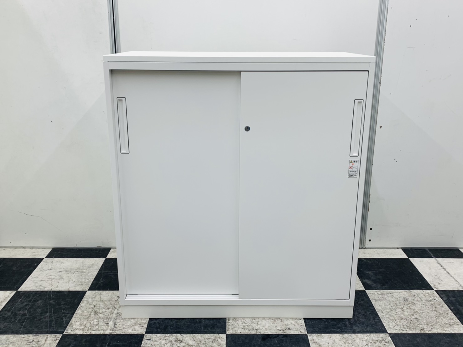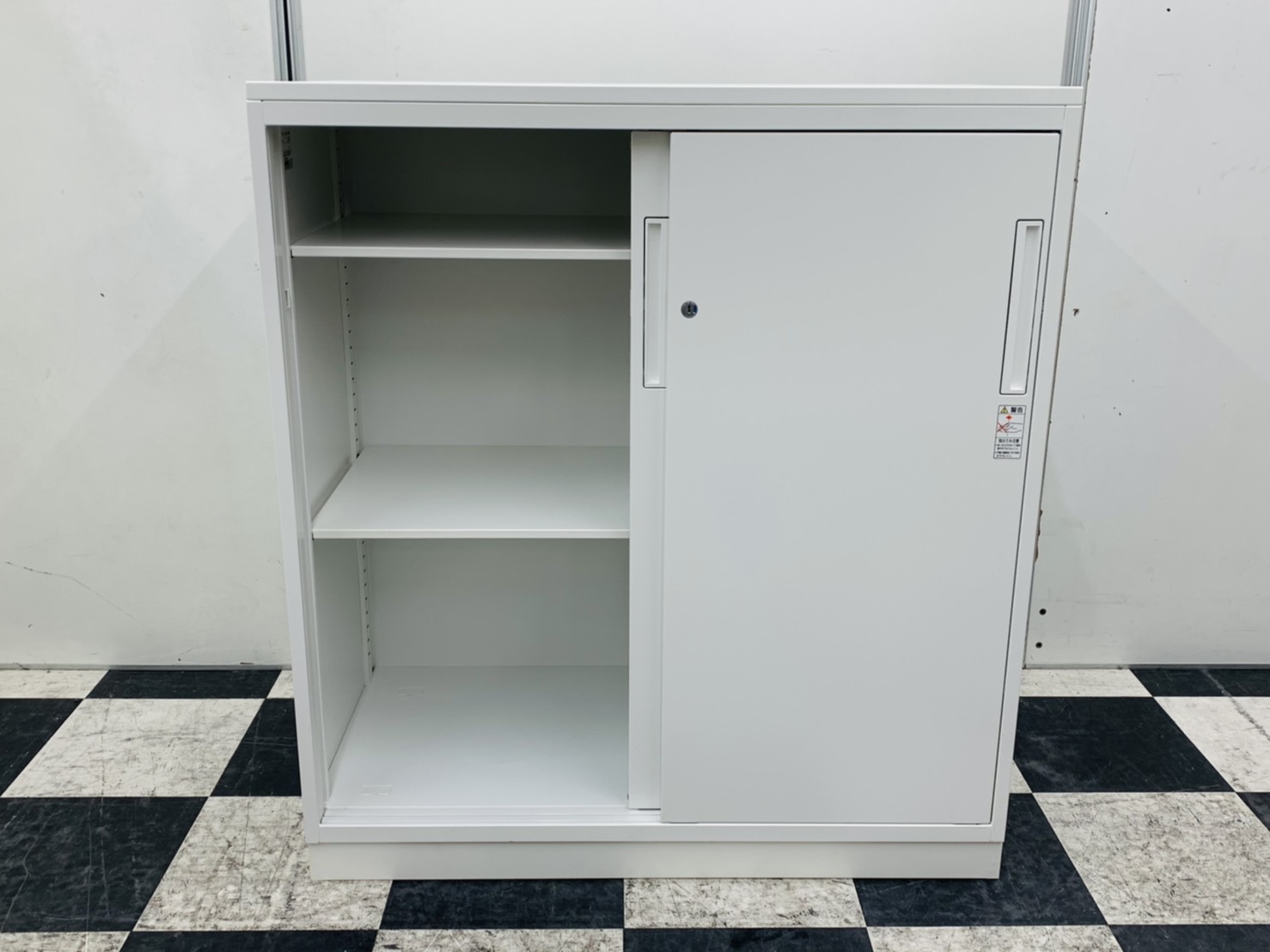 【スライド引き戸だから開閉スペースに困らない!】■コクヨ(KOKUYO)製 エディア(EDIA)シリーズ 2枚引き違い書庫 ローキャビネット シリンダー錠 天板付き ベース付き ホワイト シリンダー錠 収納 中古家具 格安 福岡 オフィス家具 九州最大級《オフィスバスターズ福岡博多店は、福岡を拠点として、日本全国へ中古オフィス用品・オフィス家具を提供しております》