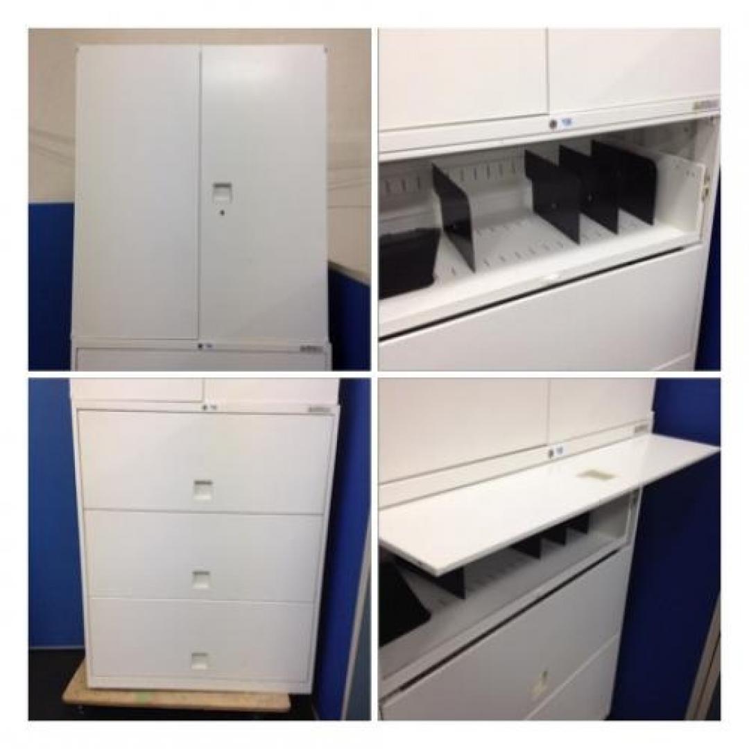 スライド式の扉+引き出しタイプの便利な書庫セットが入荷!使い勝手抜群のハイキャビネットが入荷! ■オカムラ/レクトライン/ホワイト 3枚引き戸+3段ラテラルキャビネット