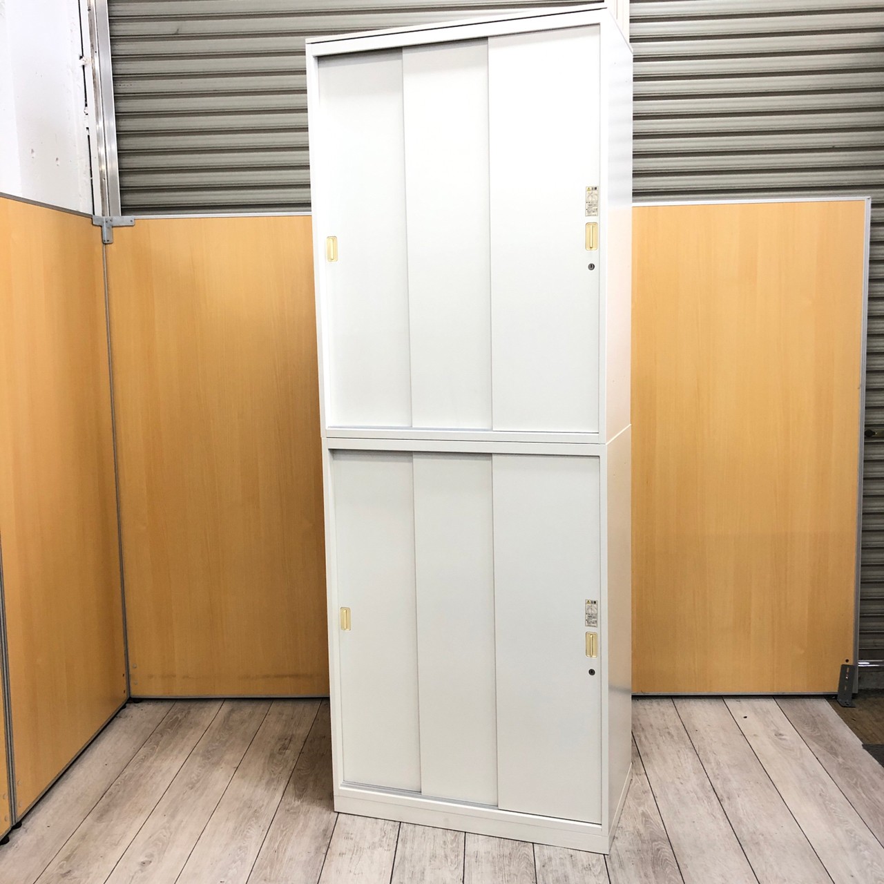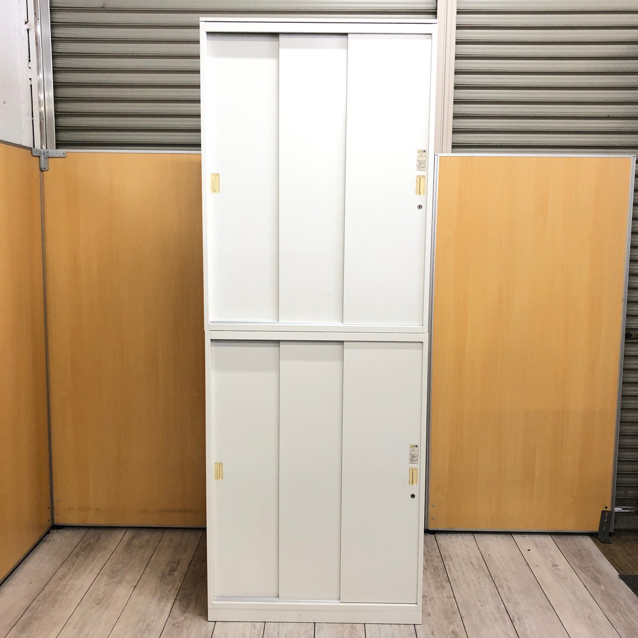 オカムラ製 レクトラインシリーズ ホワイト シリンダー W800xD450xH2150サイズ W800サイズ スリムサイズ 3枚戸タイプ ハイキャビネット スライド引き戸だから開閉スペースに困らない! 上下書庫セット 3枚引き違い書庫セット!!