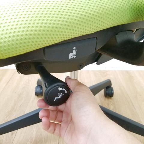 - 座面右下のダイヤル操作で、リクライニングの強弱調整が行えます。これまでのダイヤル式よりも、少ない回転数で、最弱?最強の調整が可能です。