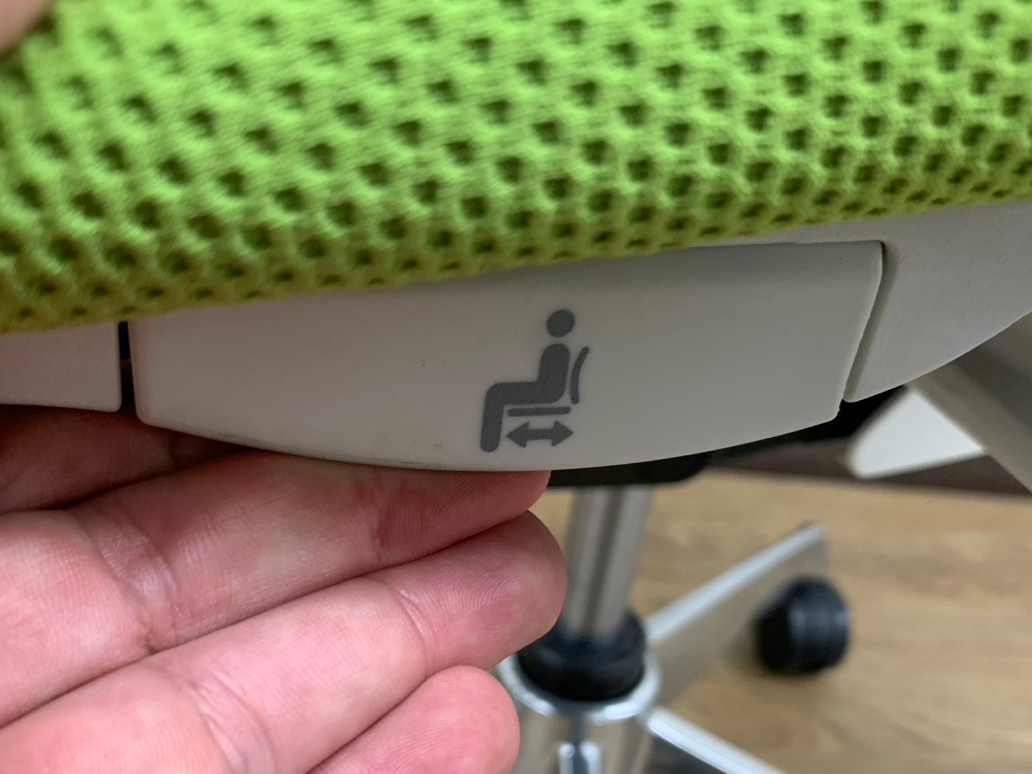 - 座面の左にあるレバー操作により、座面の奥行き調整が可能です。(ストローク:50mm)