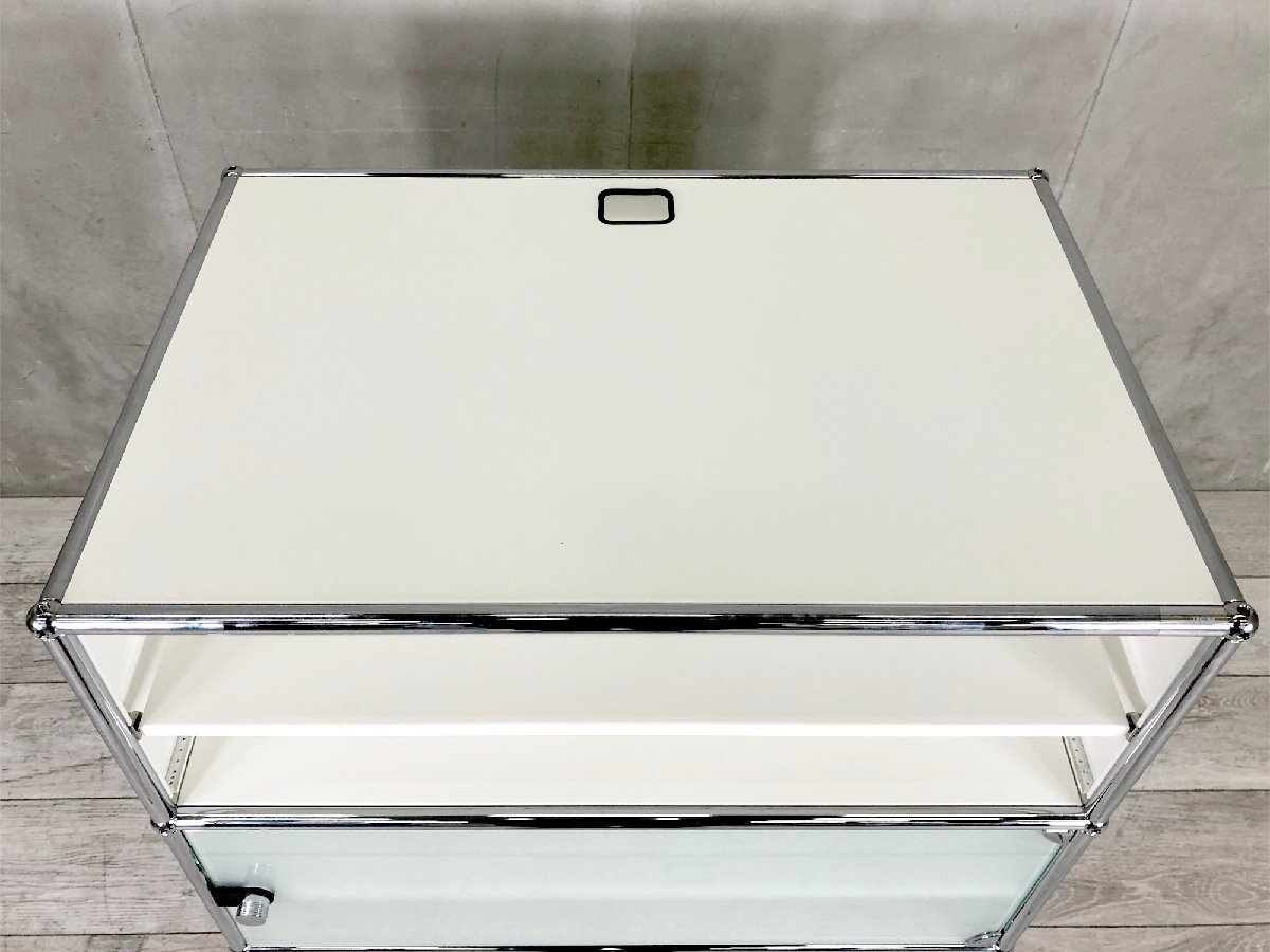 システムキャビネットメーカー『USMハラー』の1連3段キャビネットです。 上段は扉のないオープン、中段がスモークガラスの扉、下段が前倒し仕様のドロップダウンになります。