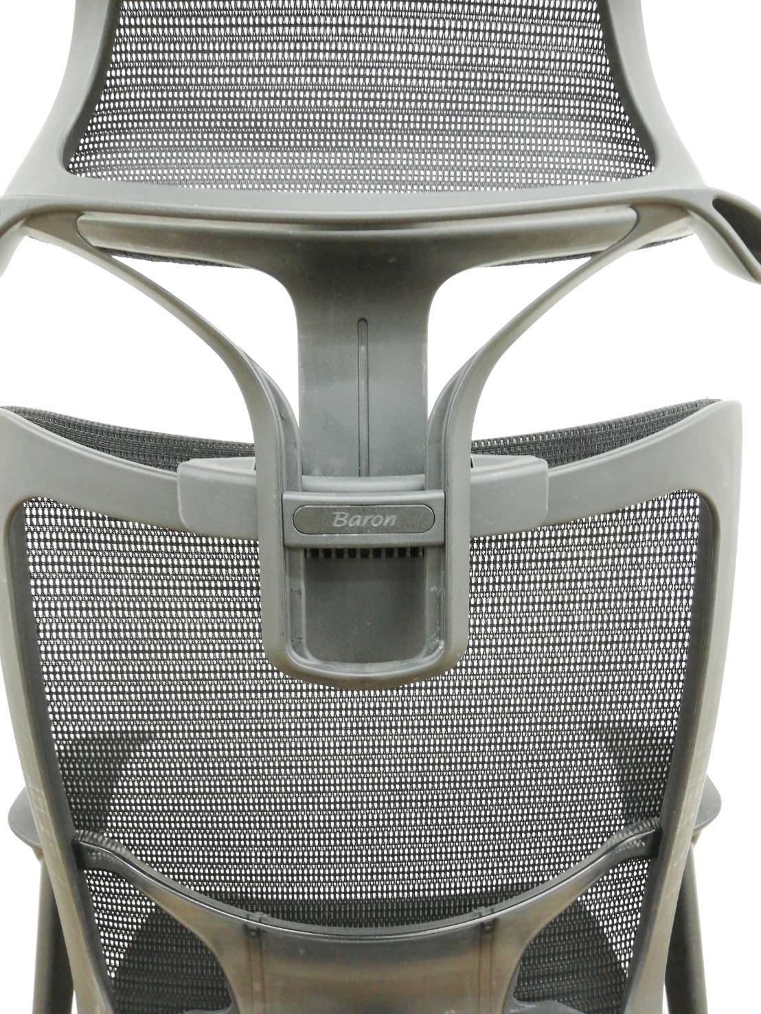 発売当時、既に人気を博していたオカムラの高級チェア、コンテッサから手元で座高調整ができるスマートオペレーション機能を取り除くなどしてリーズナブルにしたのがバロンです。その際に少しだけコンパクト化されました。そのことが、日本人の体格、日本のオフィス、家庭環境に適し、国内で多くのシェアを獲得する要因の一つになったのではないかと思います。