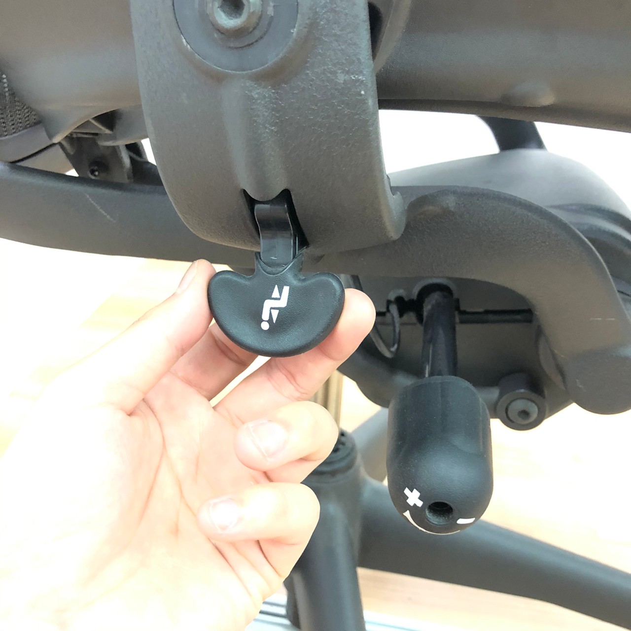 - 背もたれの裏にあるランバーサポート(パッド) の厚さは裏表で調節。上下の移動で、適切な高さ に調節できます。