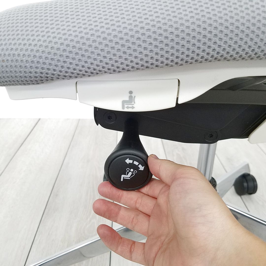 - 座面の左にあるレバー操作により、座面の奥行き調整が可能です。(ストローク:50mm)