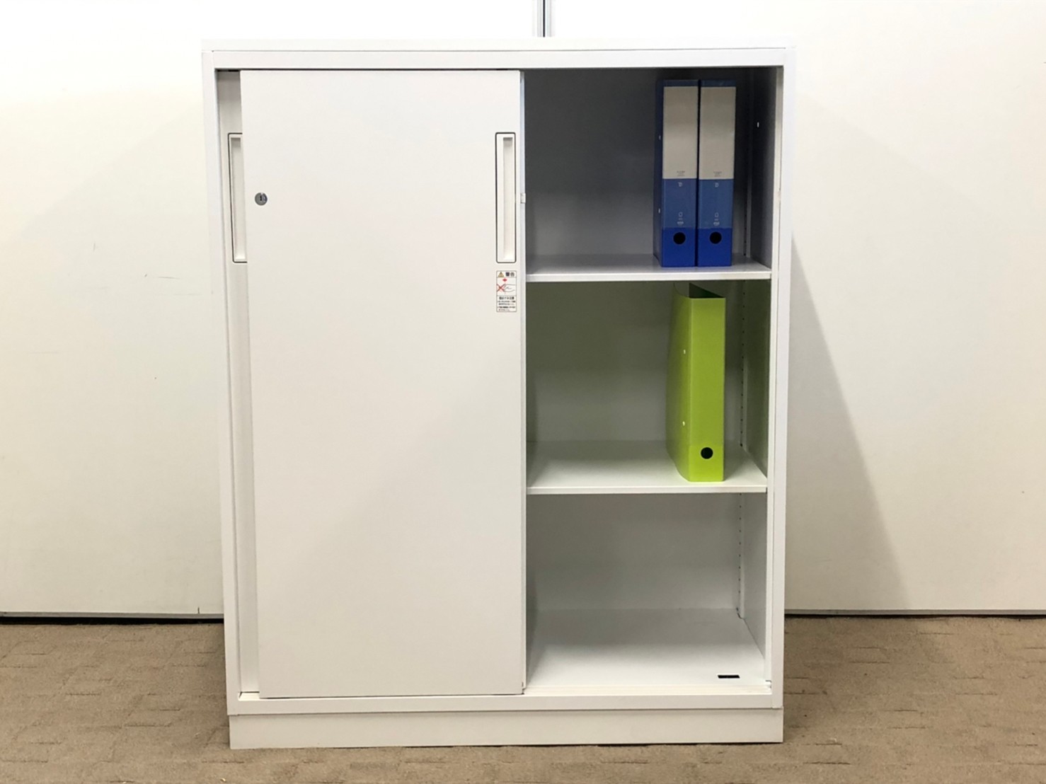 【スライド引き戸だから開閉スペースに困らない!】■コクヨ(KOKUYO)製 エディア(EDIA)シリーズ 2枚引き違い書庫 ローキャビネット シリンダー錠 天板付き ベース付き ホワイト シリンダー錠 収納 中古家具 格安 福岡 オフィス家具 九州最大級《オフィスバスターズ福岡博多店は、福岡を拠点として、日本全国へ中古オフィス用品・オフィス家具を提供しております》