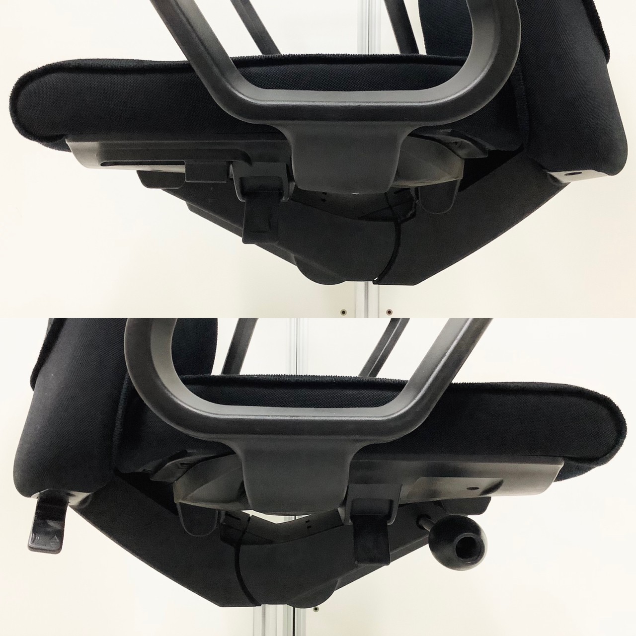 ロッキングは、任意の位置でロックすることが可能で、強さの調節は座面右下のグリップで座った状態で行えます。