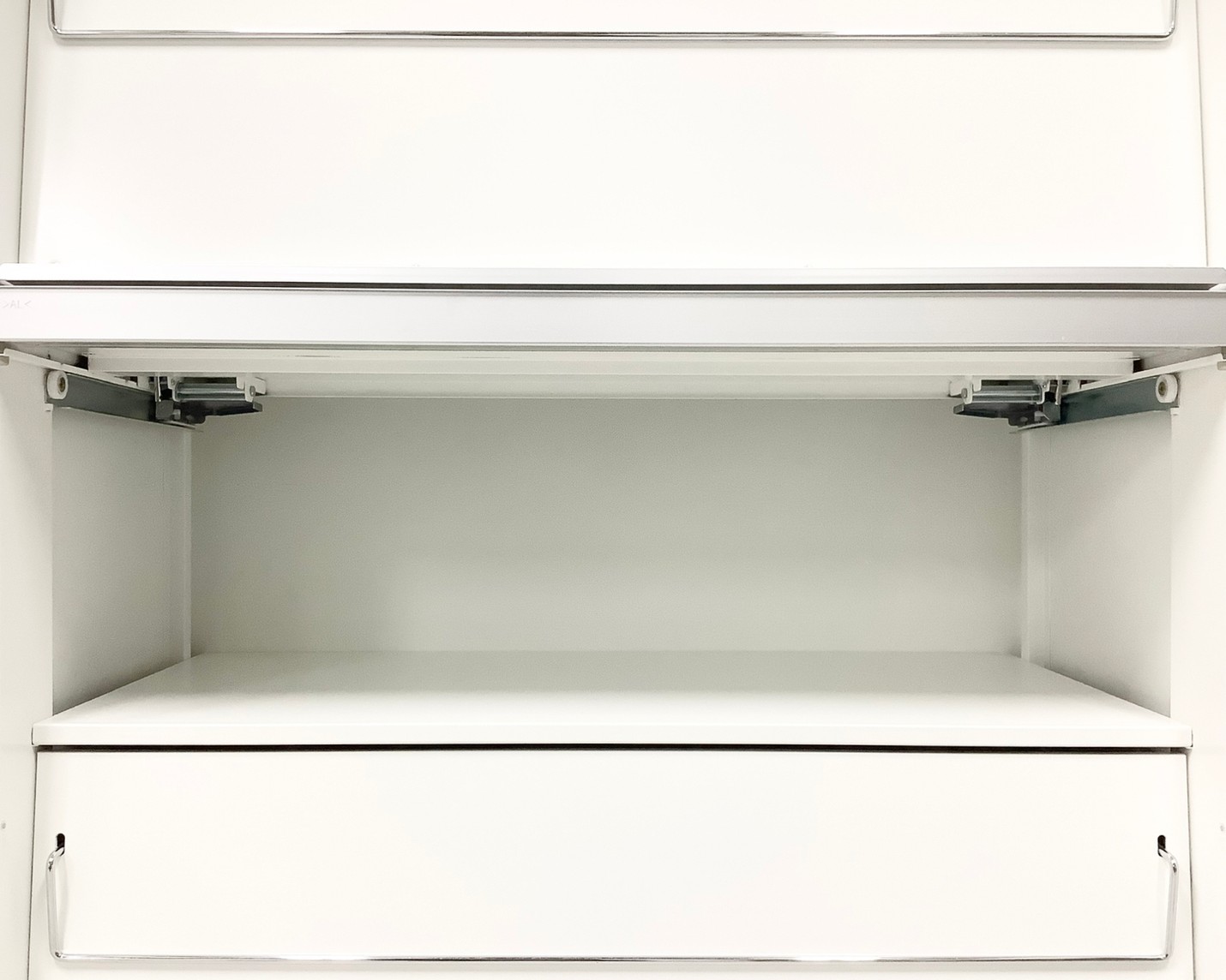 フラップ扉を開けた内部にも収納スペースがあるキャビネットです。