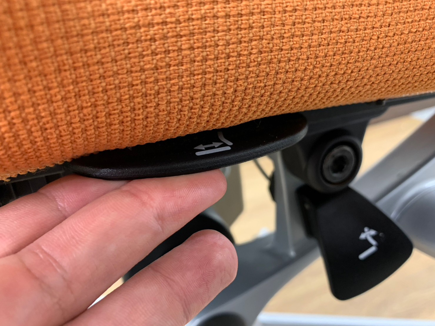 両手を自然に下ろした位置にあるレバーにて、座面の前後スライド調整(前後50mm)が可能です。