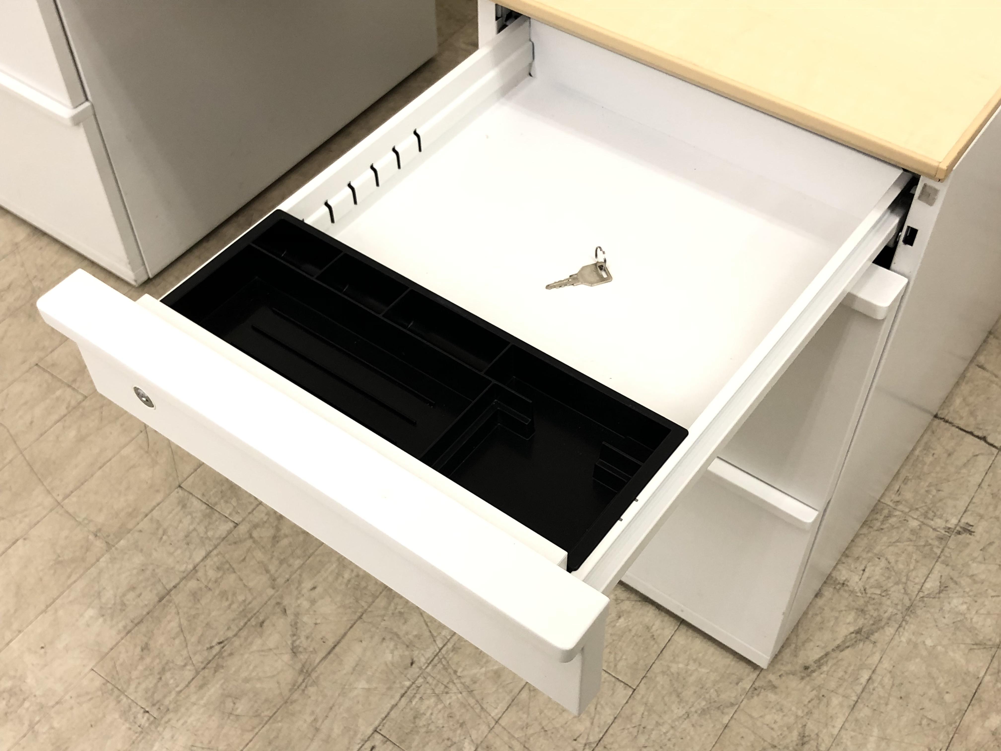 天板はナチュラルカラーの木目柄、袖引出しはホワイトカラーで、