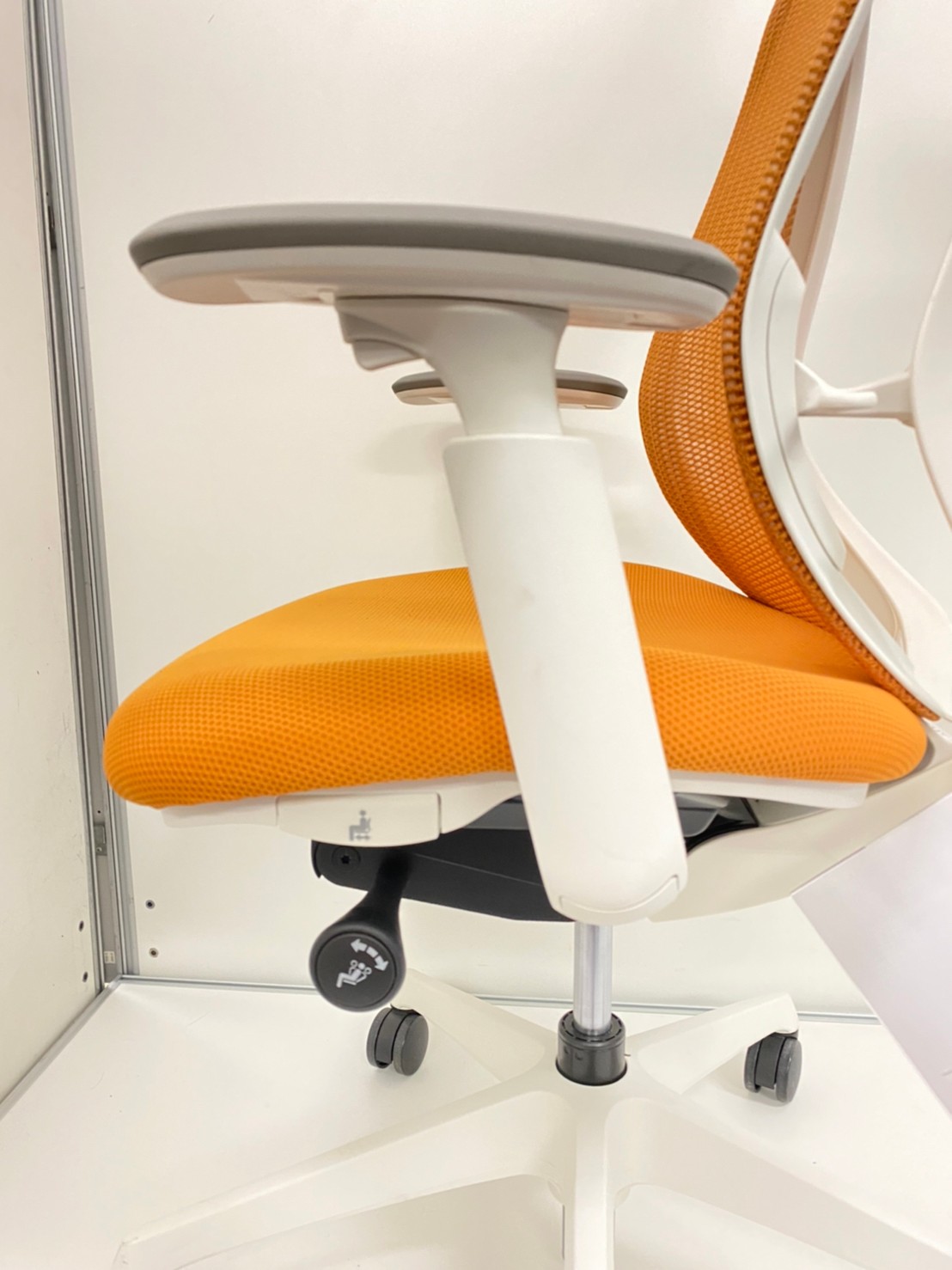 【前傾チルト機能付き】【オカムラ製品で最も人気を集める高機能メッシュチェア!】■オカムラ(okamura)製 シルフィ(Sylphy)チェア 肘付き ハイバック 背面メッシュ ■可動肘・ハンガー付き ■オレンジ ×ホワイトシェル