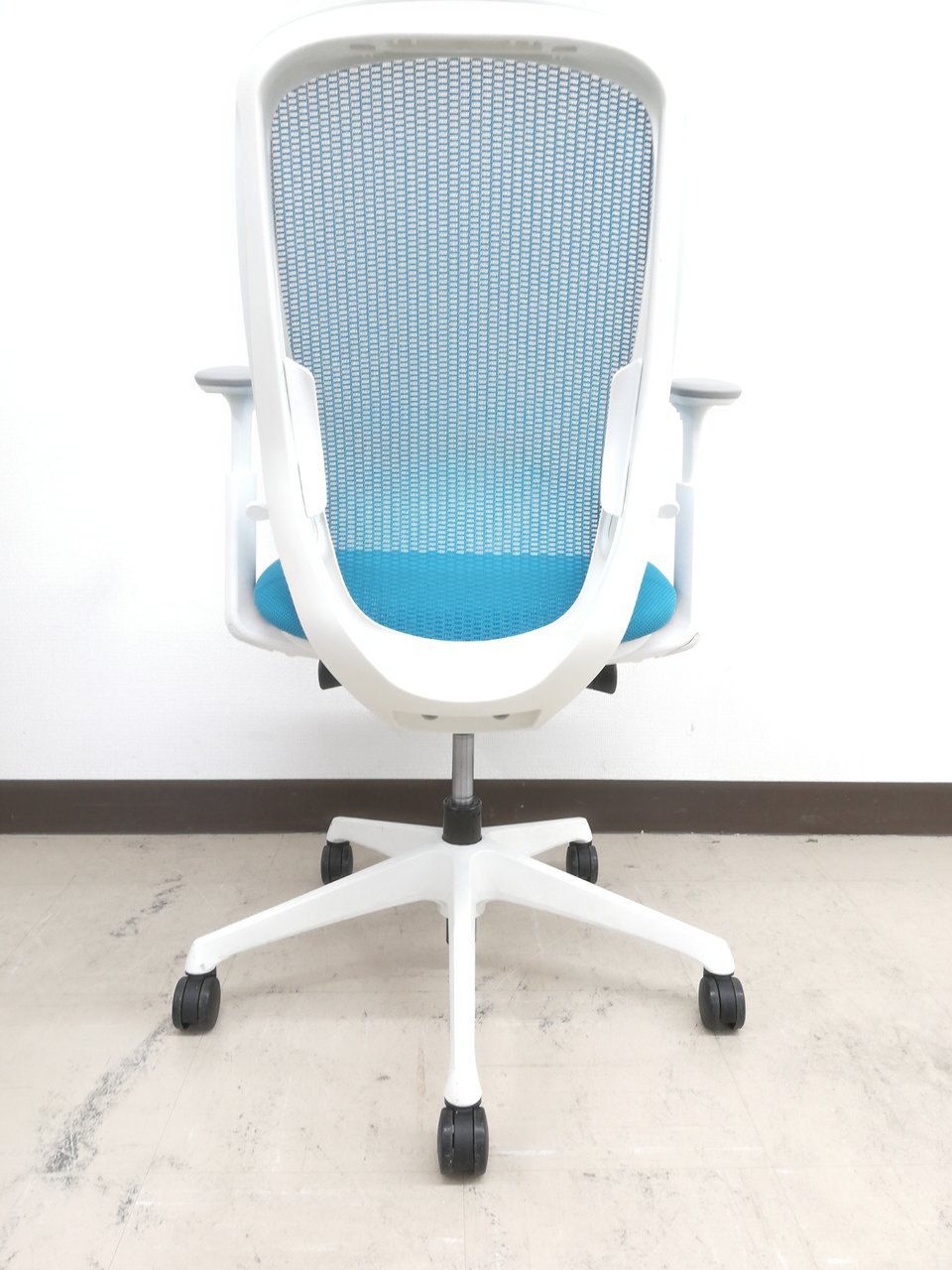 《現物写真だから安心!》オカムラ製の人気オフィスチェア【シルフィーメッシュ/可動肘/ヘッドレスト付き/ブルーグリーン】が先着1名様ご案内可能です!