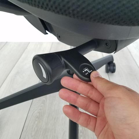 - 座面右下のダイヤル操作で、リクライニングの強弱調整が行えます。これまでのダイヤル式よりも、少ない回転数で、最弱?最強の調整が可能です。