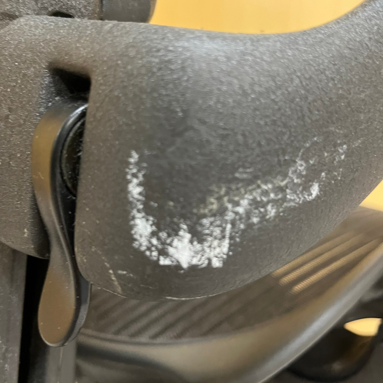 - かなり強い濃い黄ばみ・変色が商品全体にある。(例、座面・背もたれ、脚部等にある。)