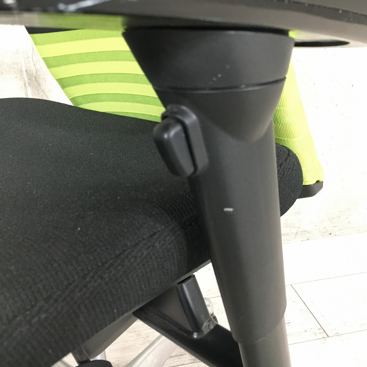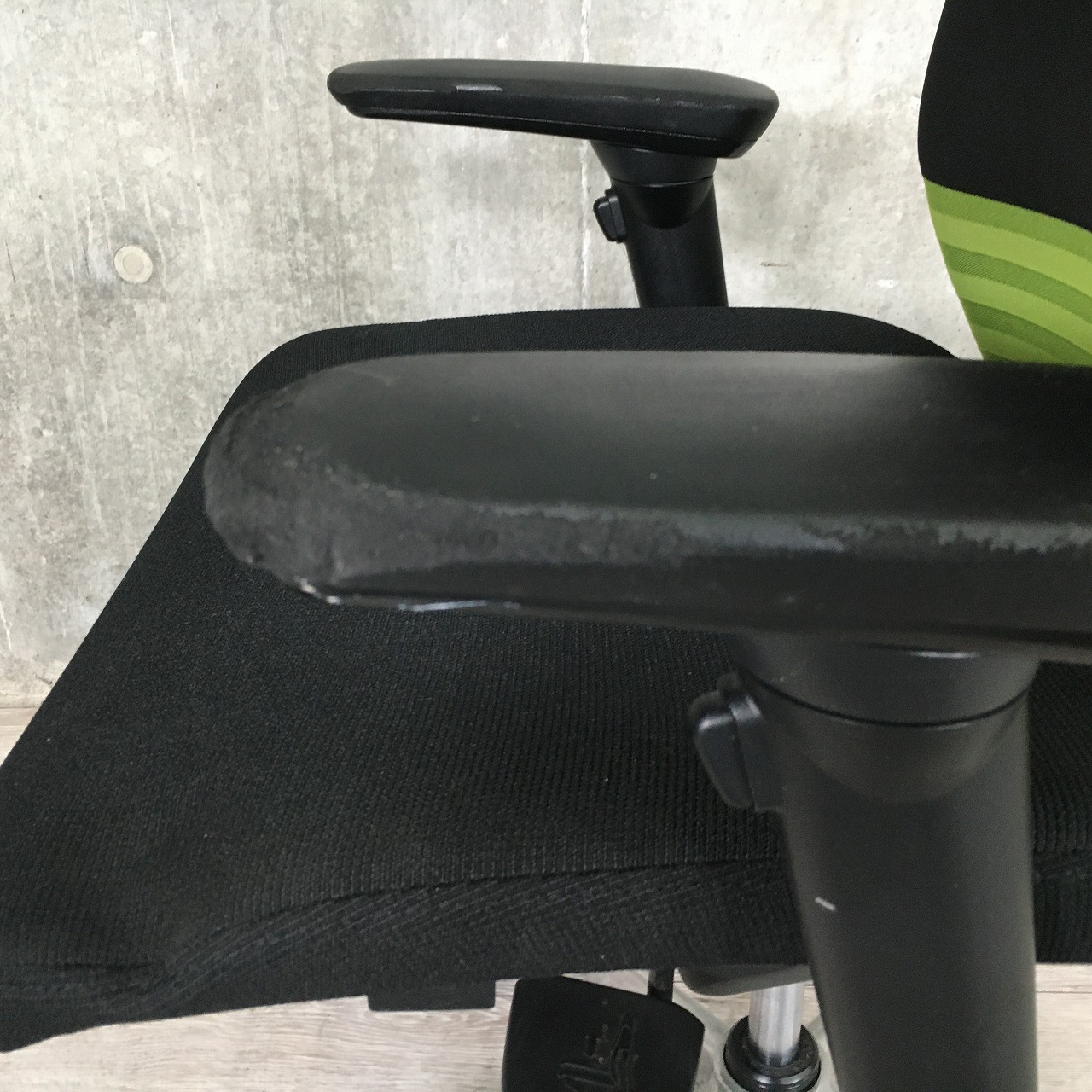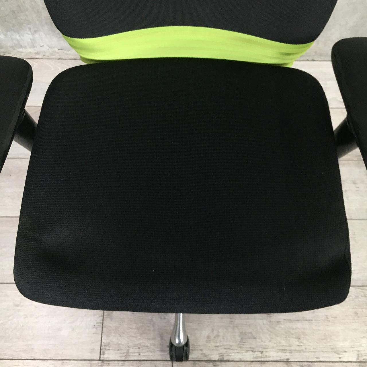 【快適な座り心地で作業効率アップ!】■オカムラ フィーゴチェア 可動肘付 シームレスタイプ ライムグリーン ハンガー付 ※肘に擦れ・削れ・欠けありのためお安く!