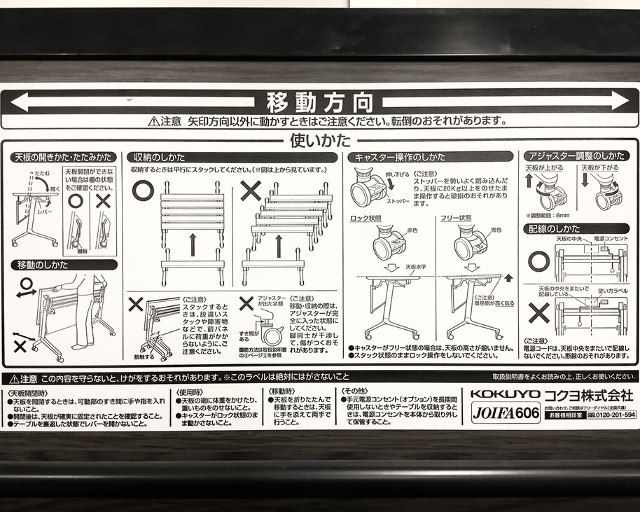- 一部不具合あり天板歪み、アジャスター無し、キャスター使用不可ようなそのテーブルの本来の効用を果たすための機能以外の一部が使用不可な状態。(例、キャスターロッ ク機能使用不可、棚板無し等がある。)