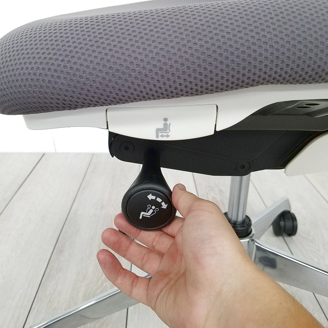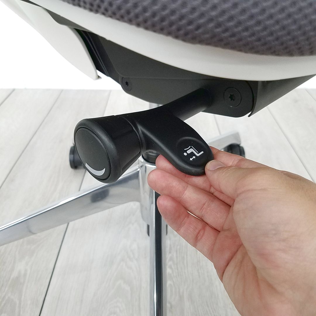 - 座面右下のダイヤル操作で、リクライニングの強弱調整が行えます。これまでのダイヤル式よりも、少ない回転数で、最弱?最強の調整が可能です。
