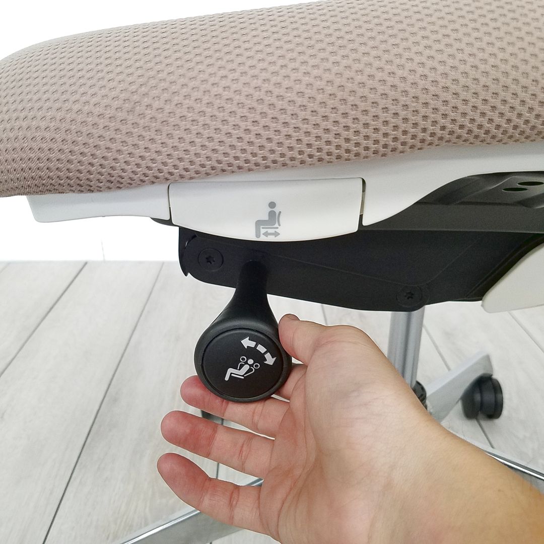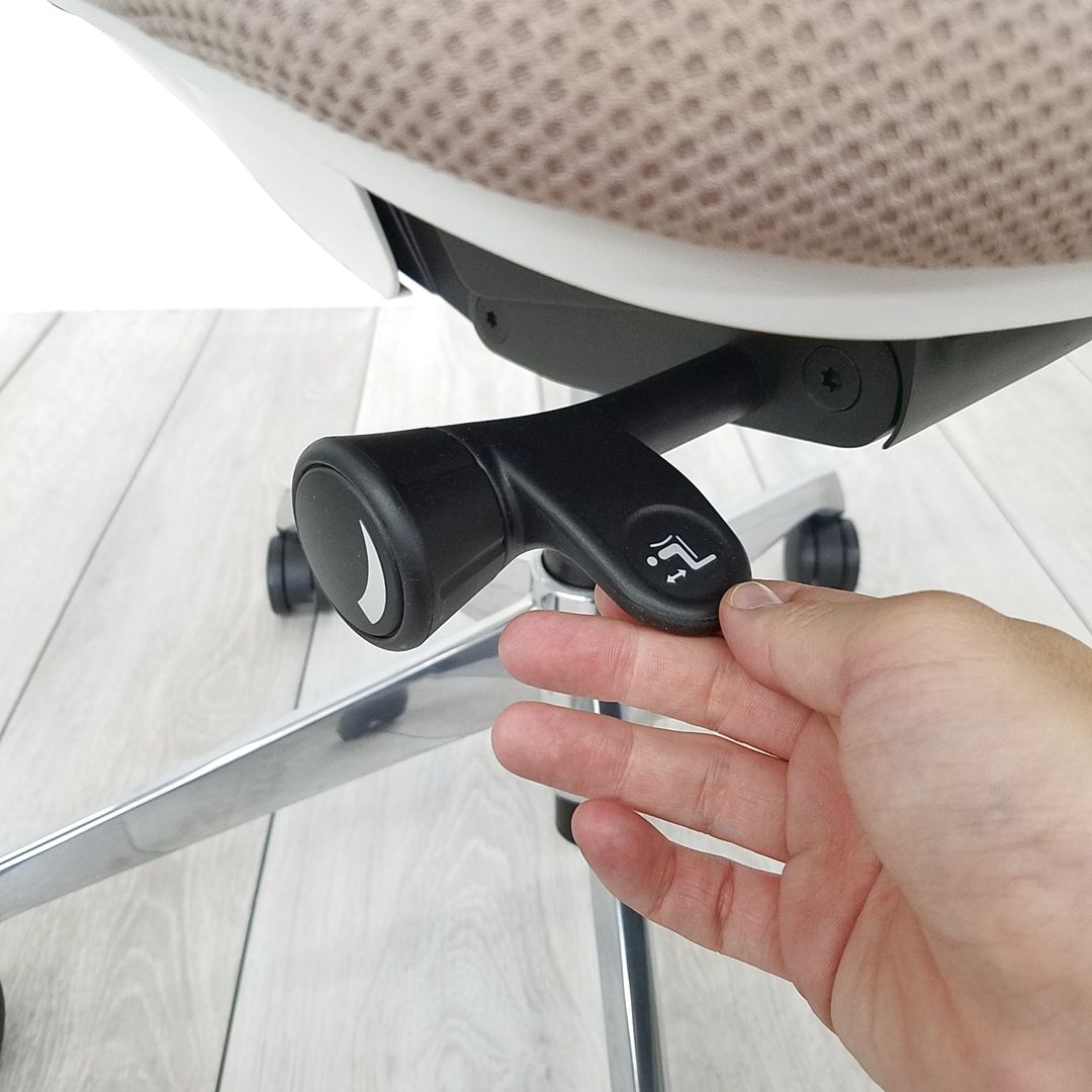 - 座面右下のダイヤル操作で、リクライニングの強弱調整が行えます。これまでのダイヤル式よりも、少ない回転数で、最弱?最強の調整が可能です。