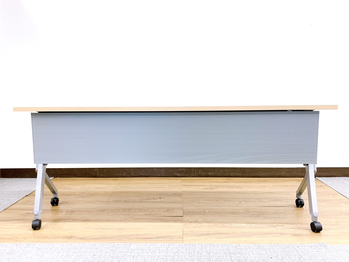 【天板跳ね上げ式でコンパクトに!キャスター付きで移動も楽々!】■オカムラ(okamura)製 フラプター(FLAPTOR)シリーズ サイドスタックテーブル 木目ナチュラル 幕板付き 《オフィスバスターズ福岡博多店は、福岡を拠点として、日本全国へ中古オフィス用品・オフィス家具を提供しております》