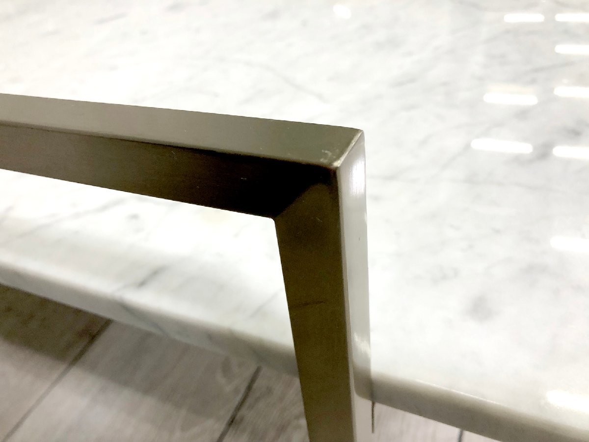 スッキリとした細いフレームを大型の大理石天板を支えフレームや天板が飛び出ることで生まれるアンバランスな組み合わせをあえてデザインに取り入れることで存在感のあるテーブルに仕上がっています。