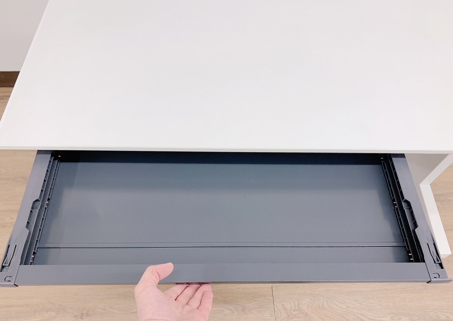 - 地震時、センター引出しが飛び出さないよう、ラッチ機構を装備。脚はデスクの横ズレを軽減させる設計になっています。
