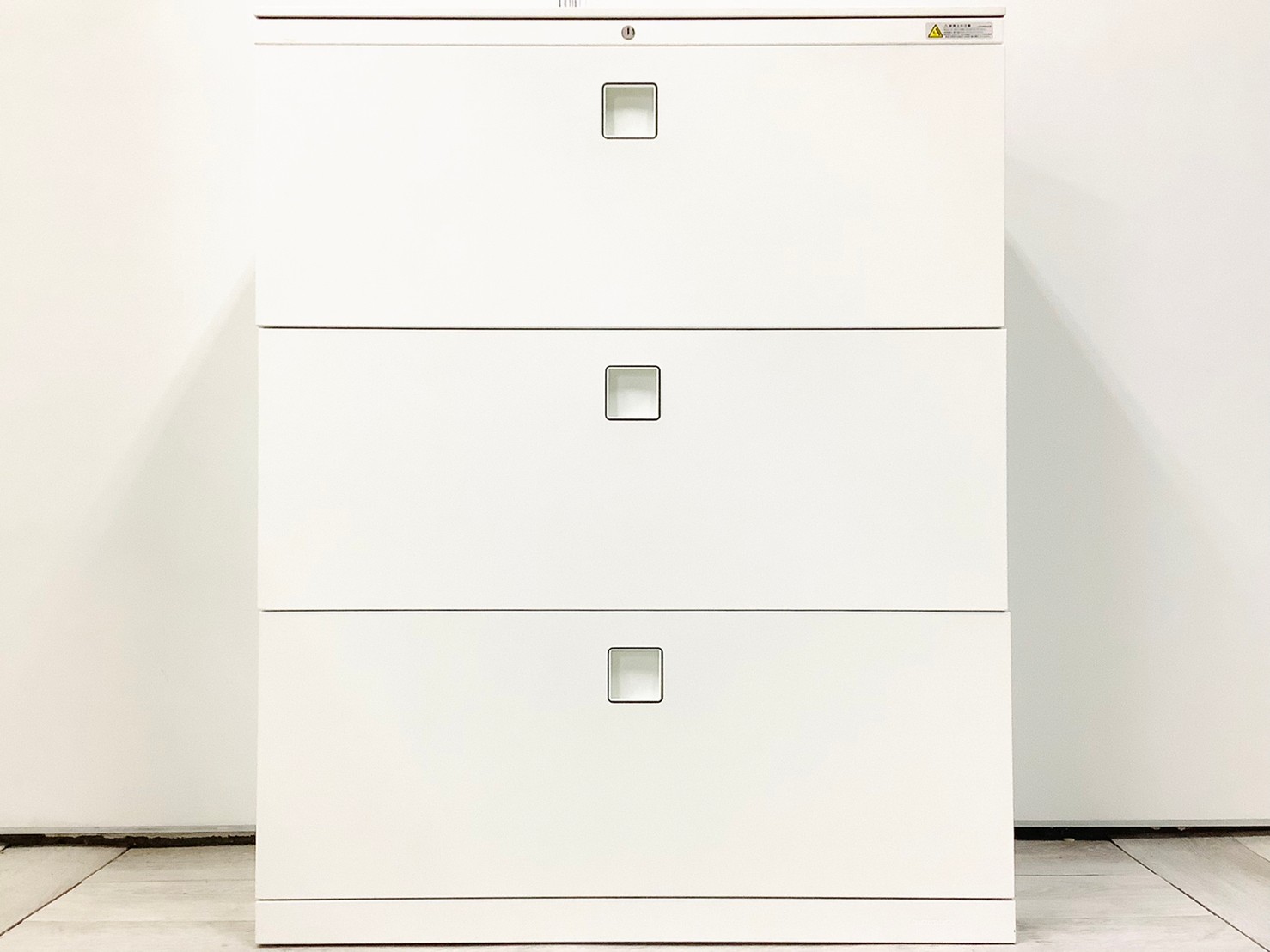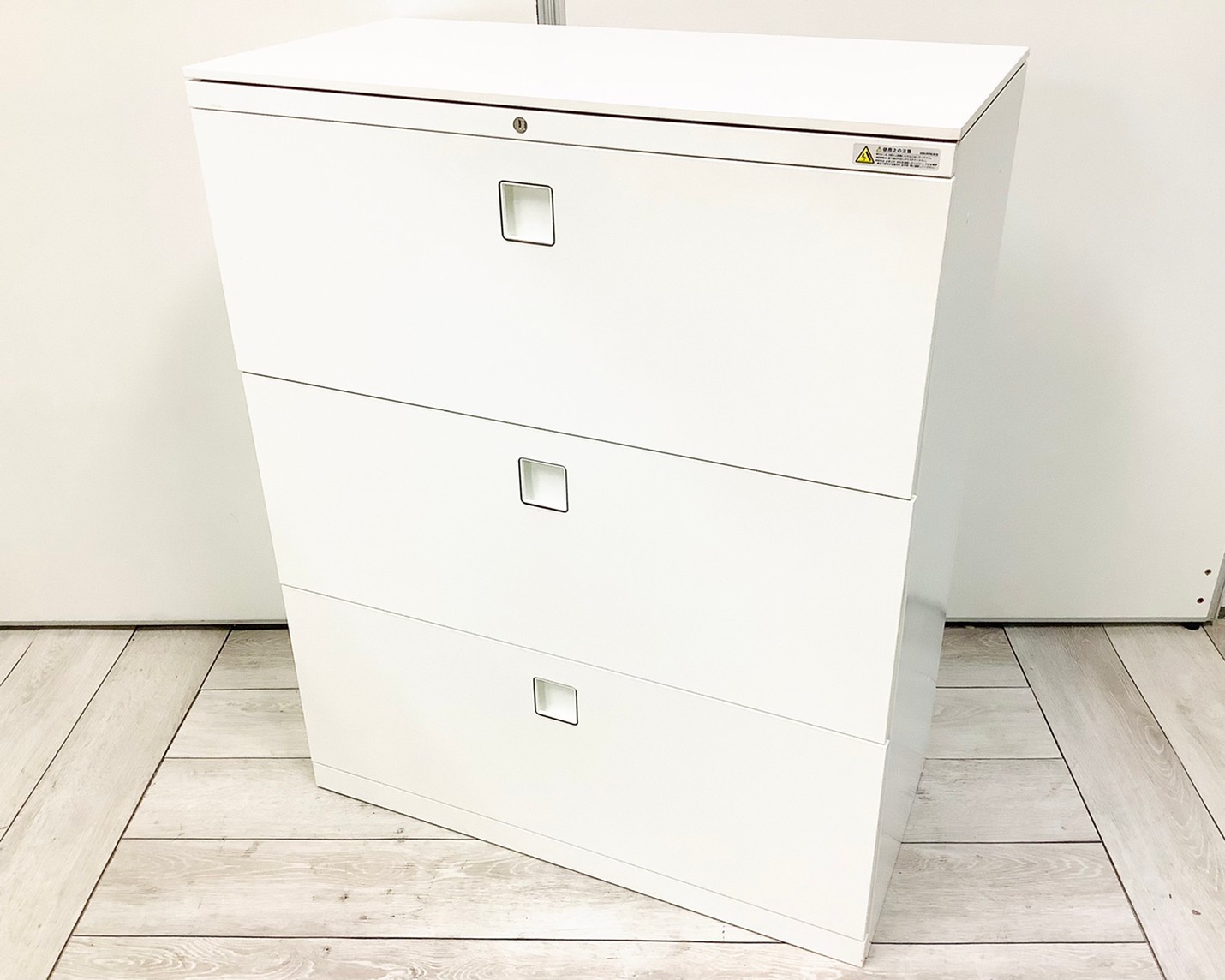 【ファイル収納にオススメ!高品質で使いやすい人気シリーズの3段ラテラル書庫!】■オカムラ(okamura)製 レクトラインシリーズ 3段ラテラル書庫 ローキャビネット H1100㎜ ■ホワイト ■シリンダー鍵 ■天板付き(天板:ホワイト) ※日焼け有