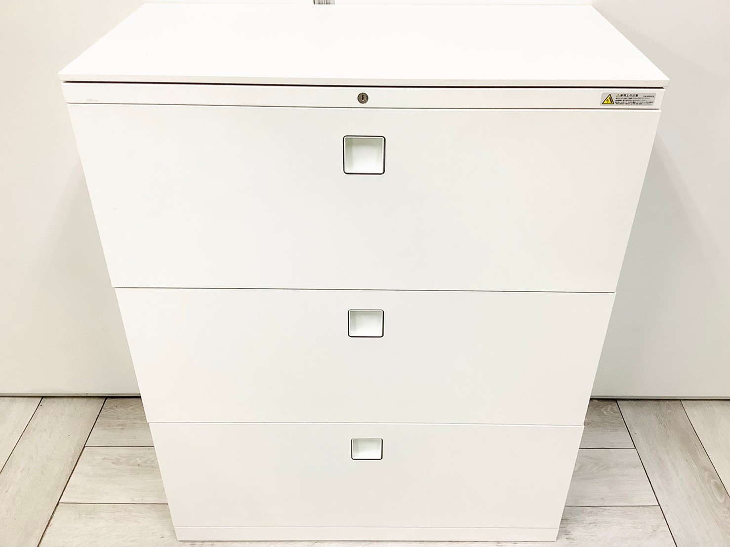 【オフィスの必需品!大容量の三段キャビネット!】■オカムラ(okamura)製 レクトラインシリーズ 3段ラテラル ローキャビネット ■ベース付 ■シリンダー錠 ■ホワイト 【弊社使用欄:A01037187】