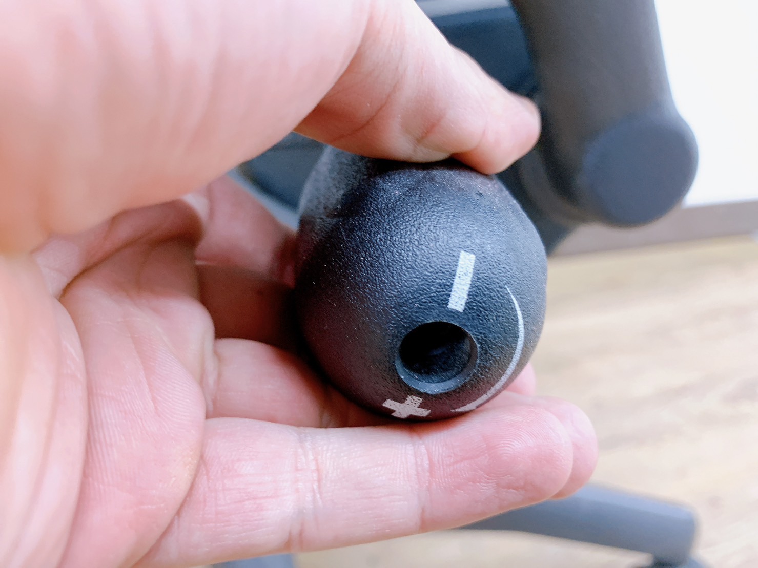 - ノブを+方向に回すと背もたれのリクライニング が硬くなり、-方向に回すと柔らかくなります。