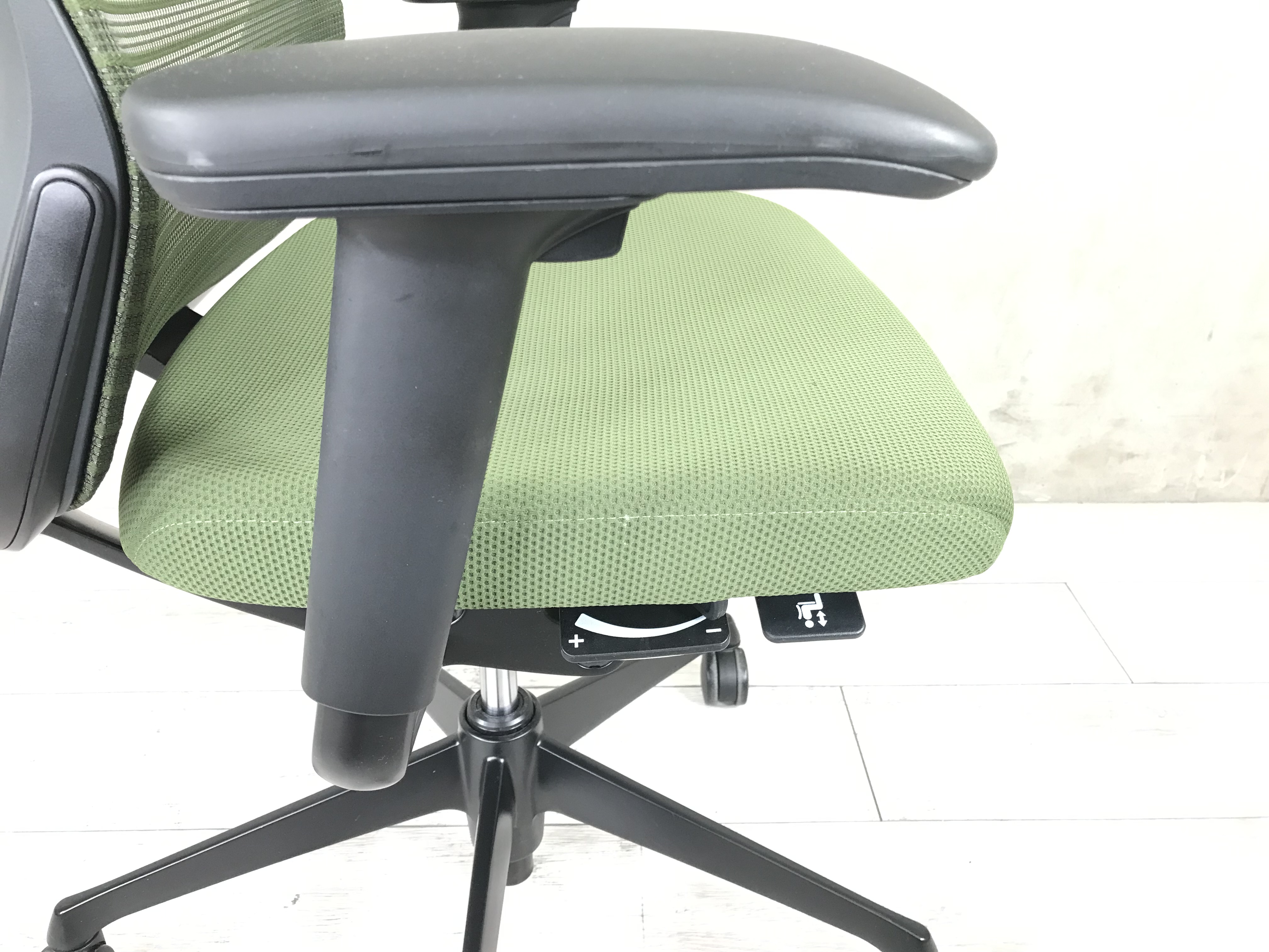 座面の高さや前後などの基本的な調整レバーが座面裏の前方に集約されており、姿勢を変えずに調節ができます。