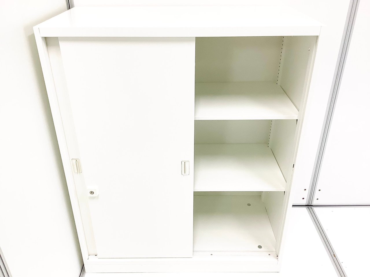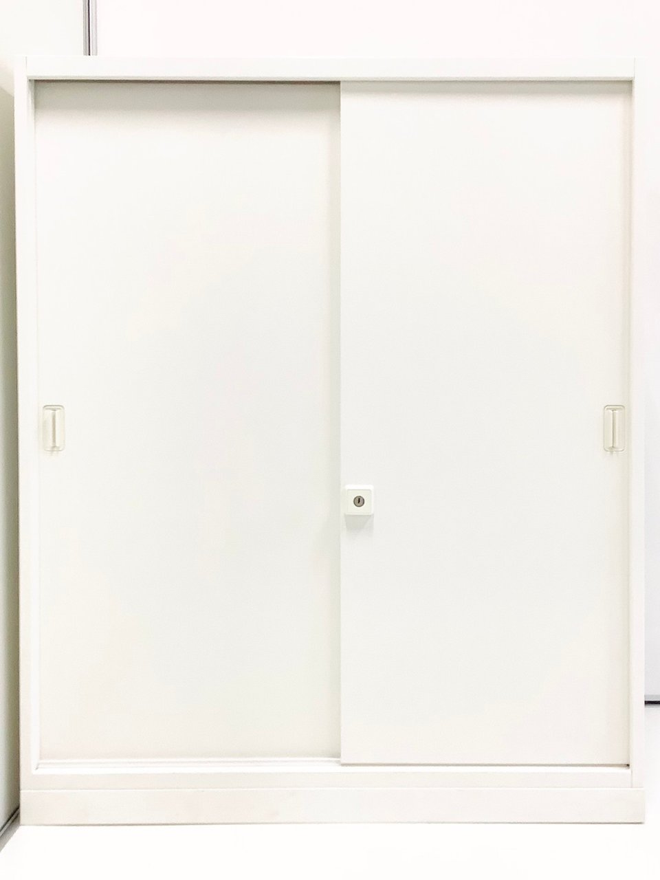 スライド式の扉のため導線を邪魔しません!使い勝手抜群の2枚引き違い書庫が入荷! ■オカムラ/レクトライン/ホワイト 2枚引き戸