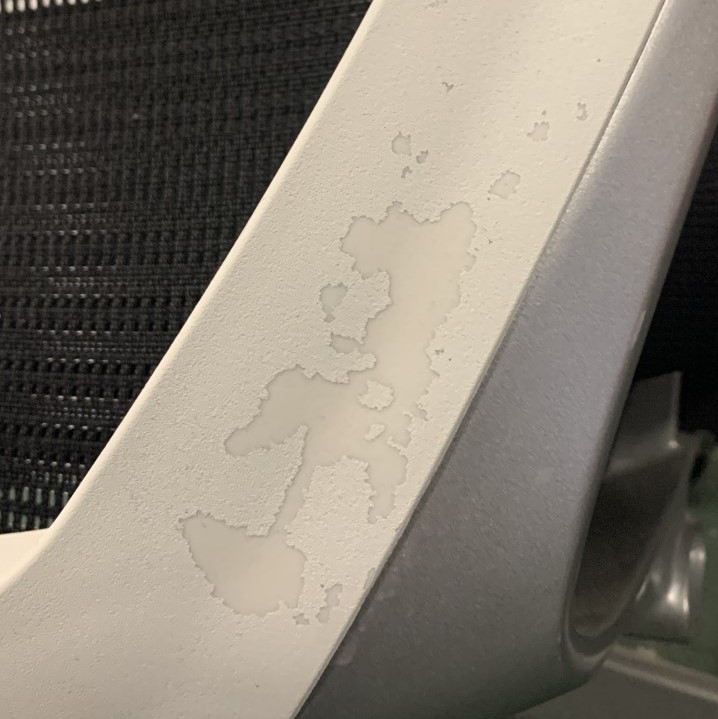 - かなり強い濃い黄ばみ・変色が商品全体にある。(例、座面・背もたれ、脚部等にある。)