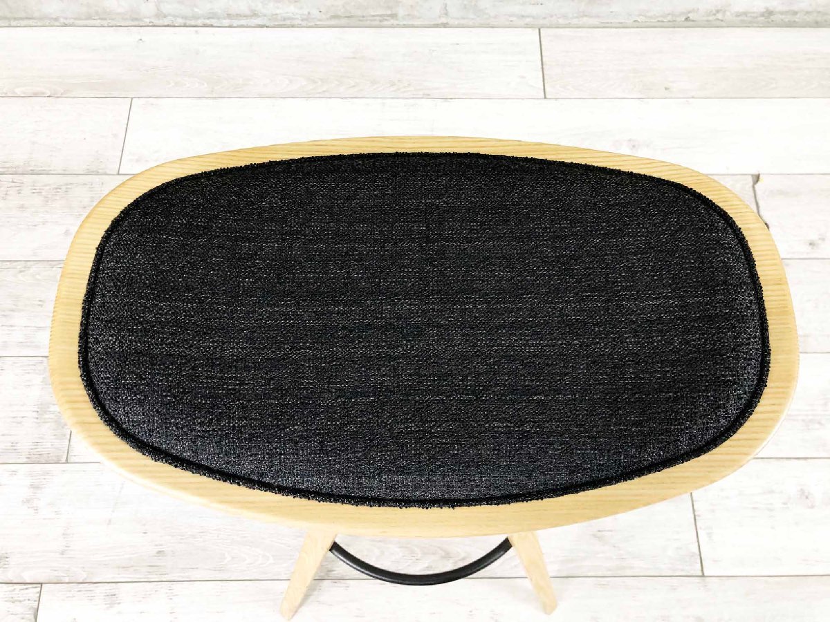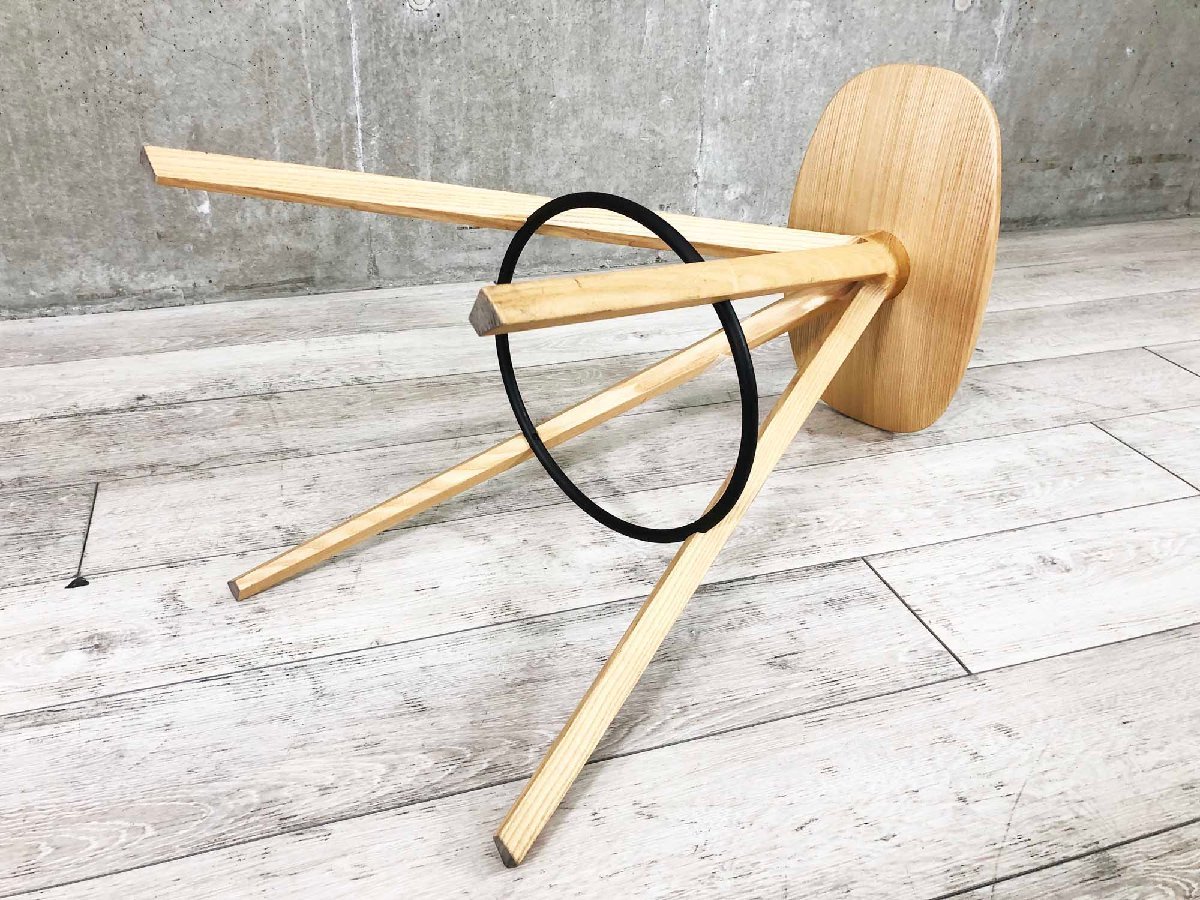 馬の鞍をイメージさせる座と、そこからきれいに伸びる4本の脚を、北海道産タモ材の表情豊かな木目が引き立てています。