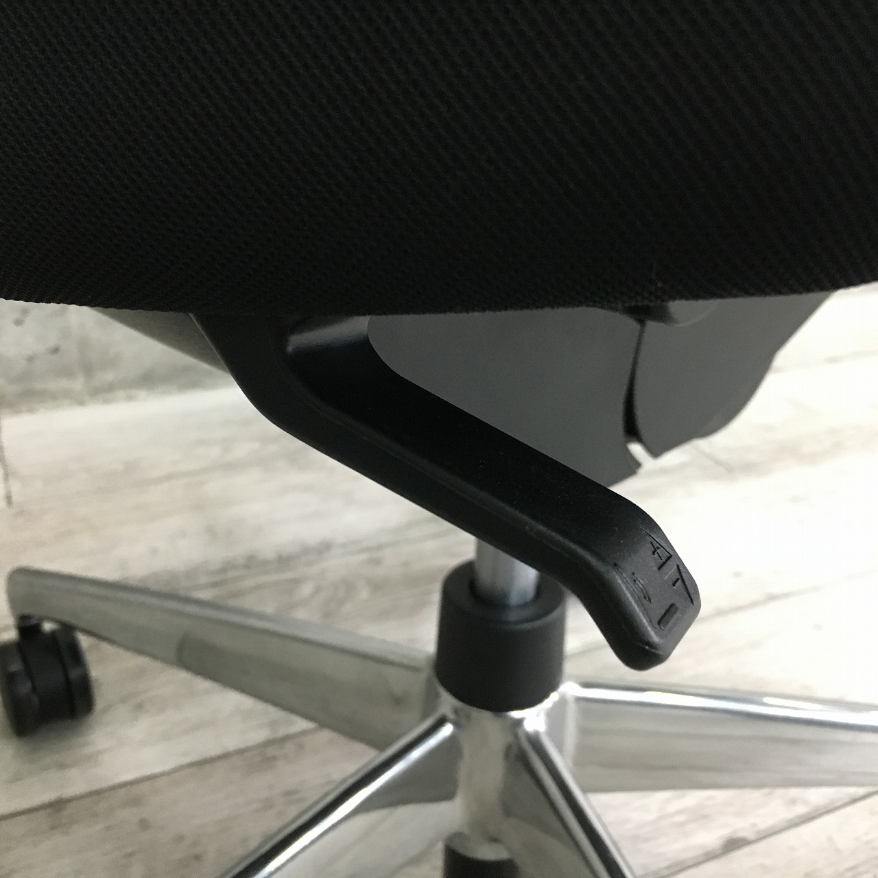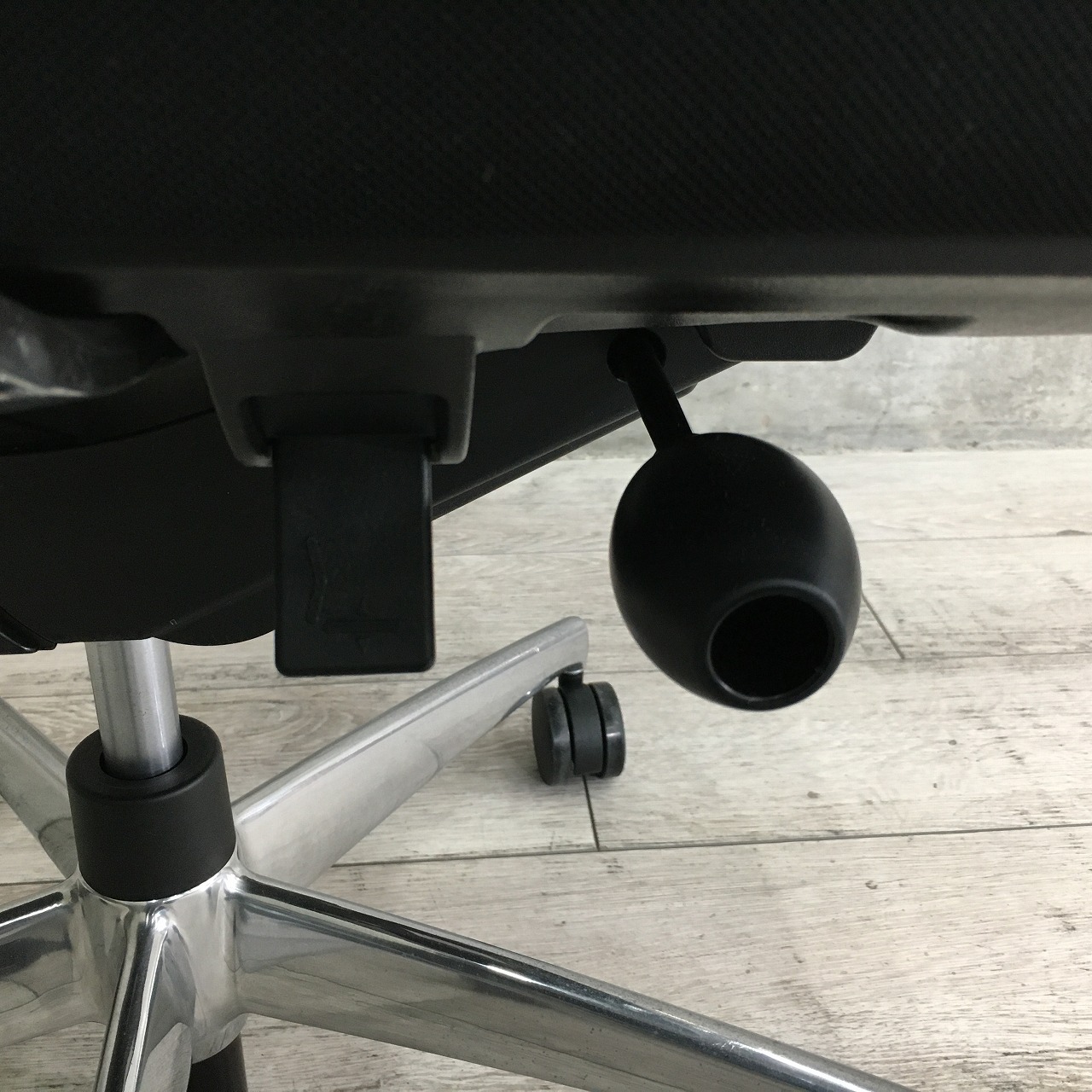 ロッキングは、任意の位置でロックすることが可能で、強さの調節は座面右下のグリップで座った状態で行えます。