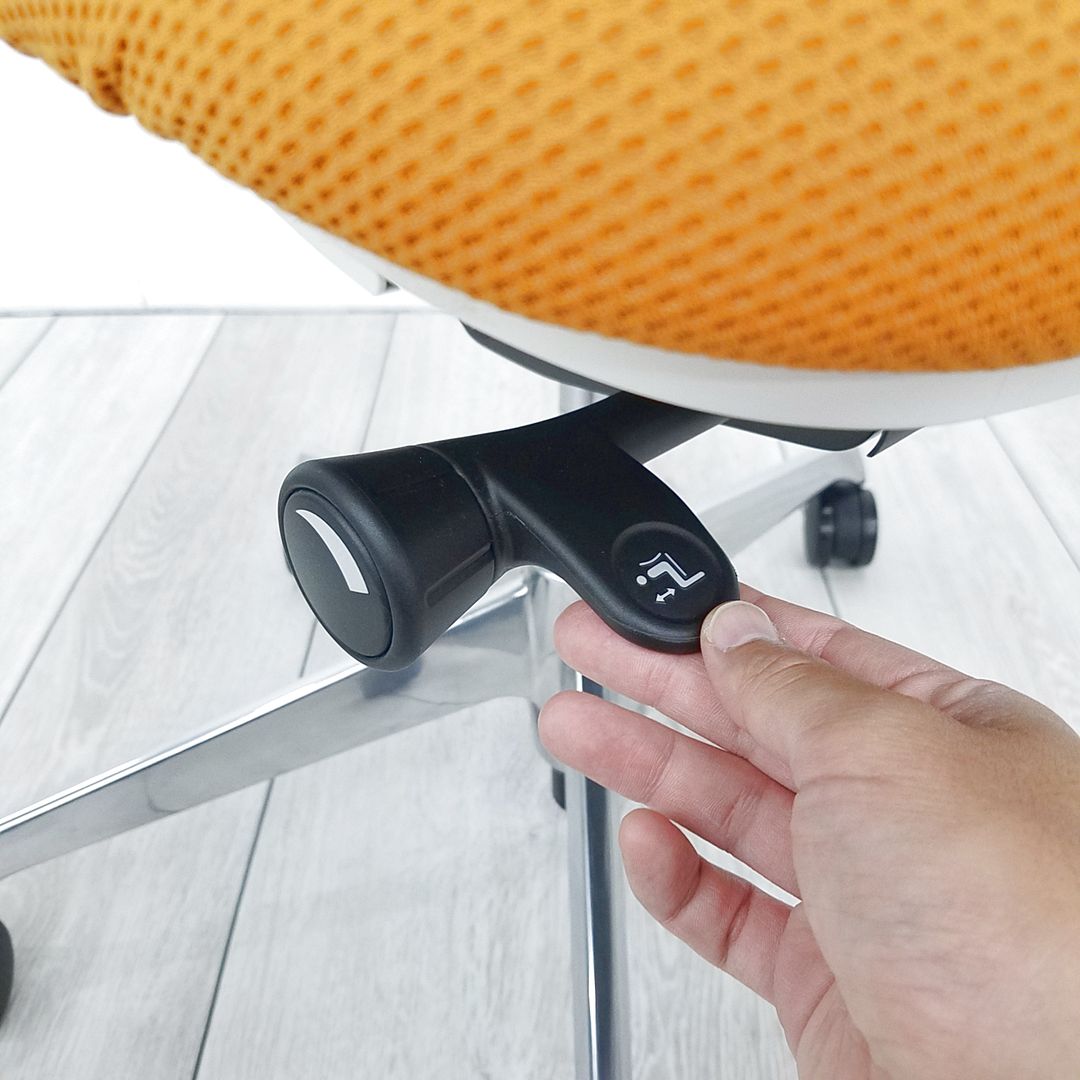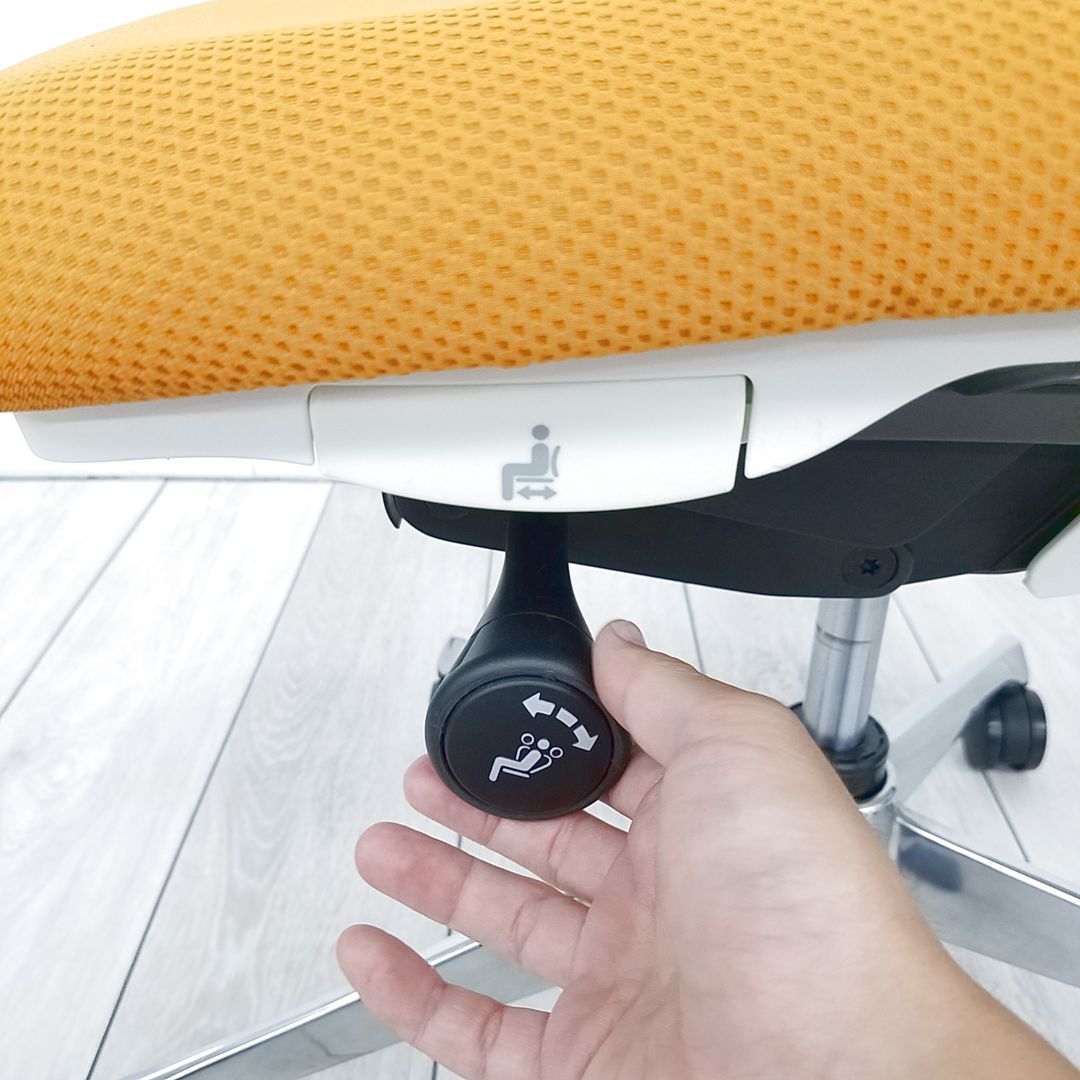 - 座面左下のダイヤルでリクライニングの固定と解除が行えます。 前傾ポジションをとることも可能です。