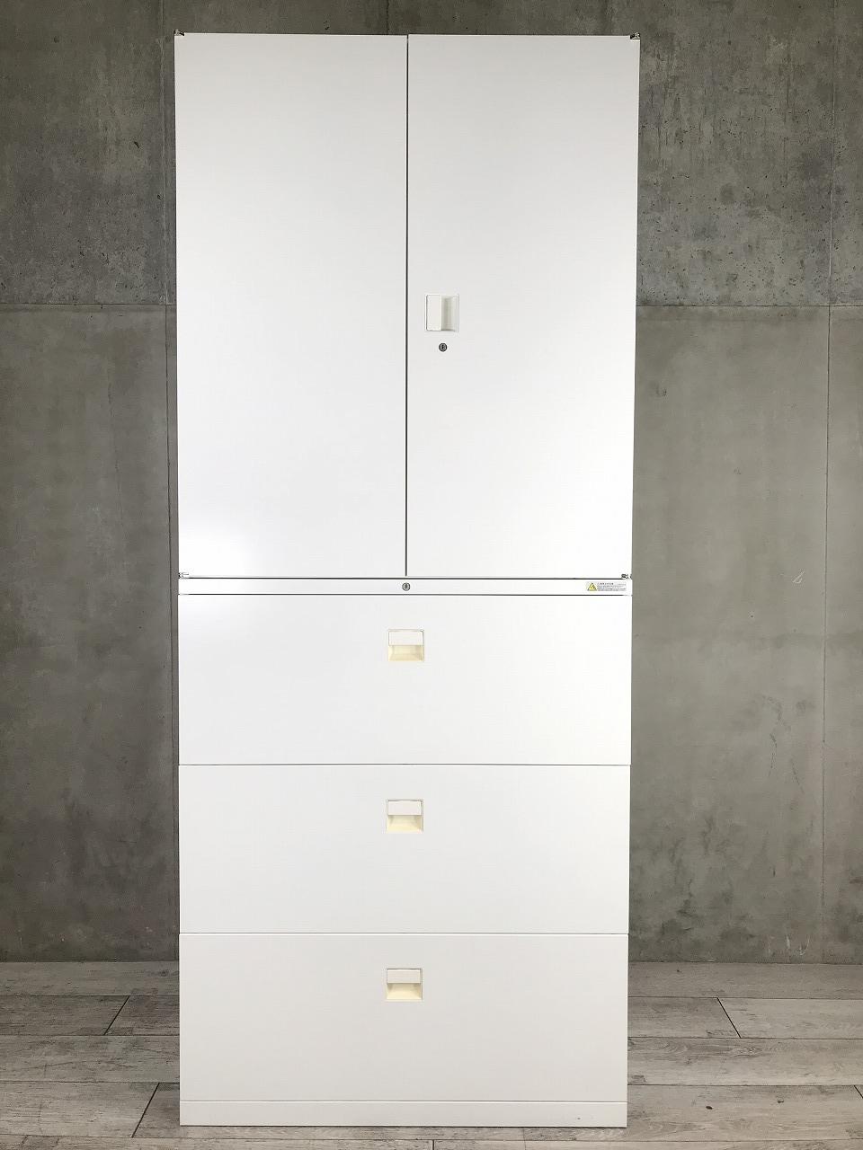 【訳アリ品】【収納量抜群の書庫セット!観音開き+引き出しタイプの人気の組み合わせ!】■オカムラ製 SAデュオライン 両開き+3段ラテラル 書庫セット ハイキャビネット ■ホワイト ■シリンダー錠