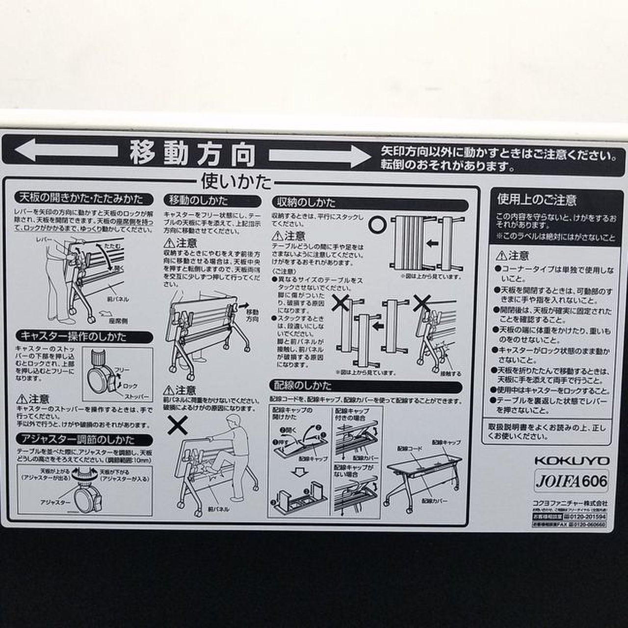 - 一部不具合あり天板歪み、アジャスター無し、キャスター使用不可ようなそのテーブルの本来の効用を果たすための機能以外の一部が使用不可な状態。(例、キャスターロッ ク機能使用不可、棚板無し等がある。)