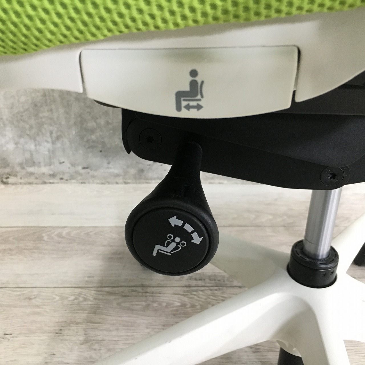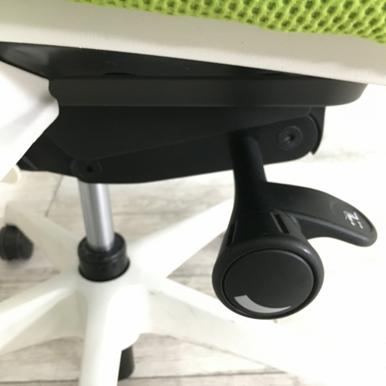 - 座面右下のダイヤル操作で、リクライニングの強弱調整が行えます。これまでのダイヤル式よりも、少ない回転数で、最弱?最強の調整が可能です。