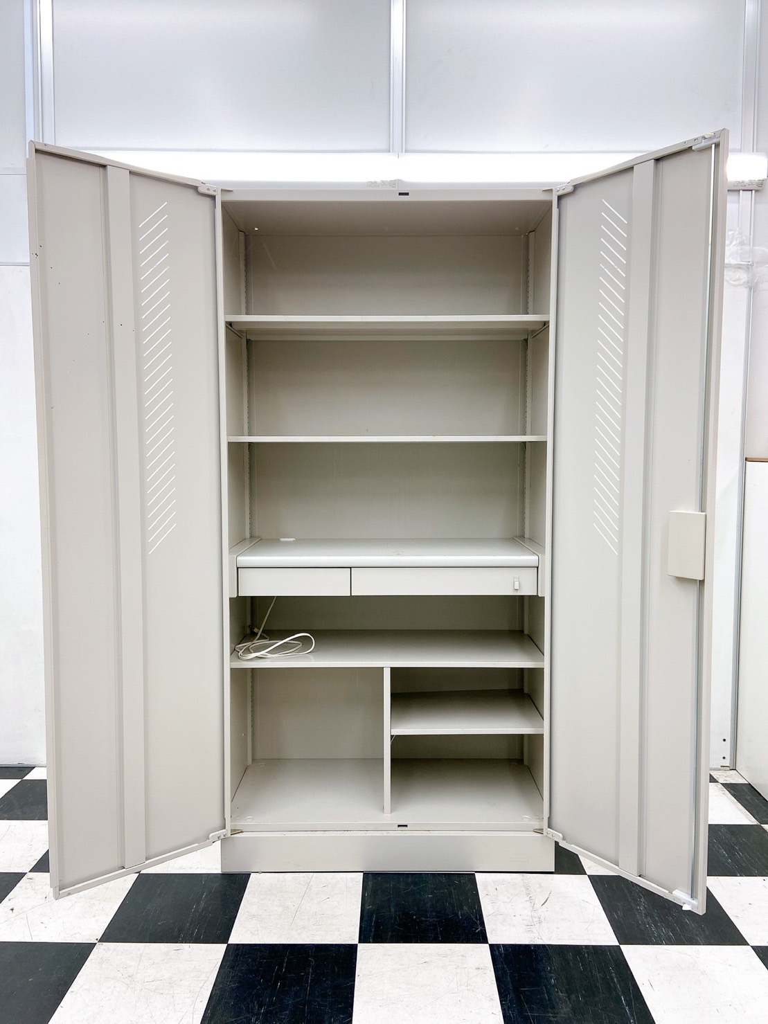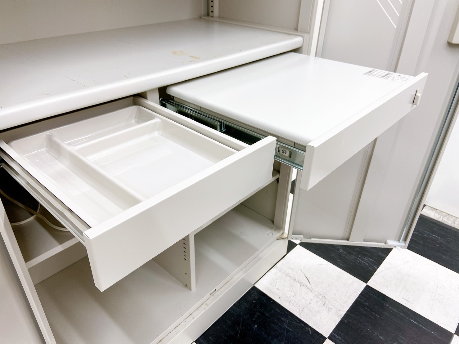 - 一部不具合ありそ引出の開閉不可、施錠不可、棚板無しといったの書庫の本来の効用を果たすための機能以外の一部が使用不可(例、扉、引出の開閉がしづらいなどがある。 )