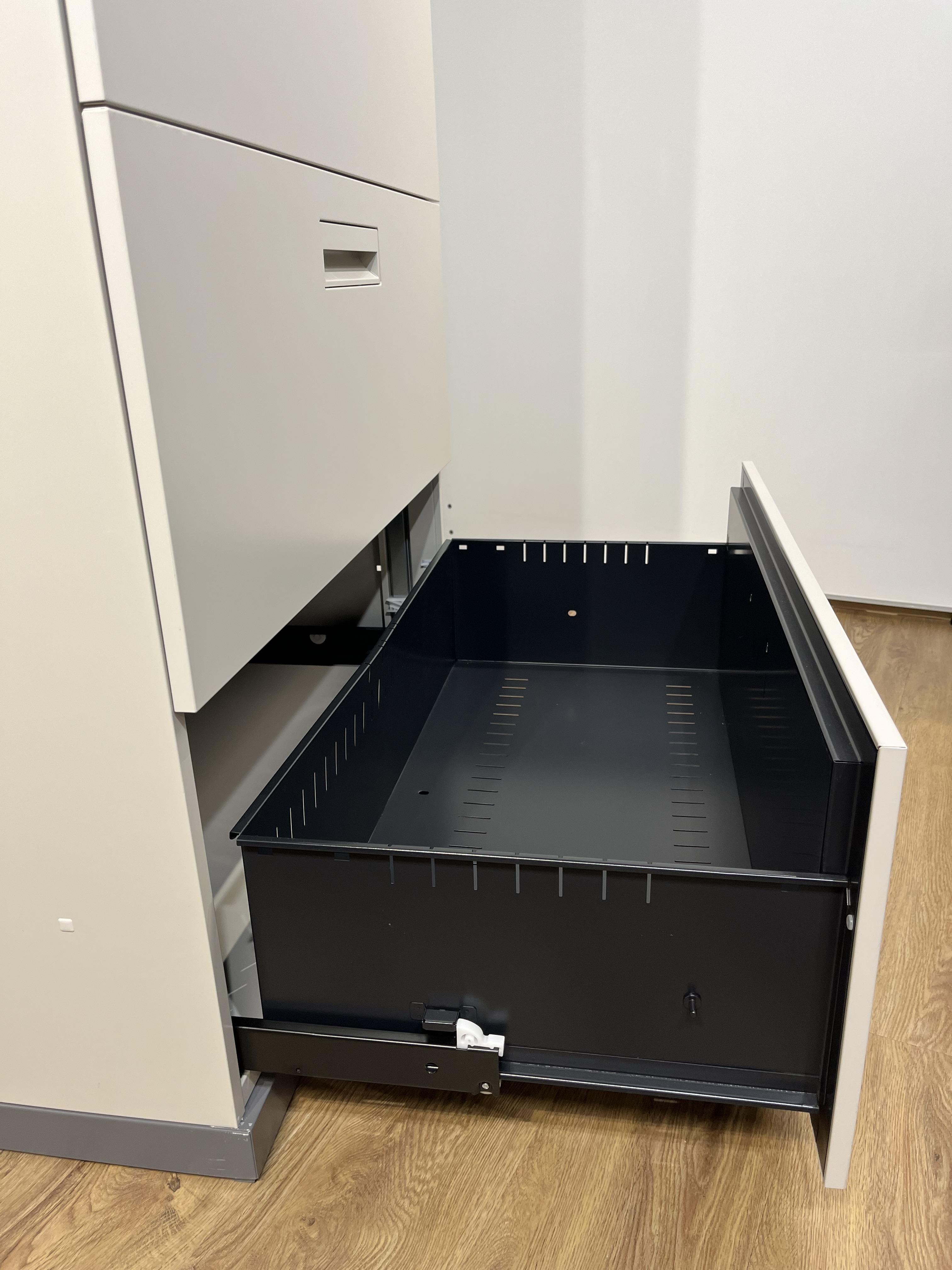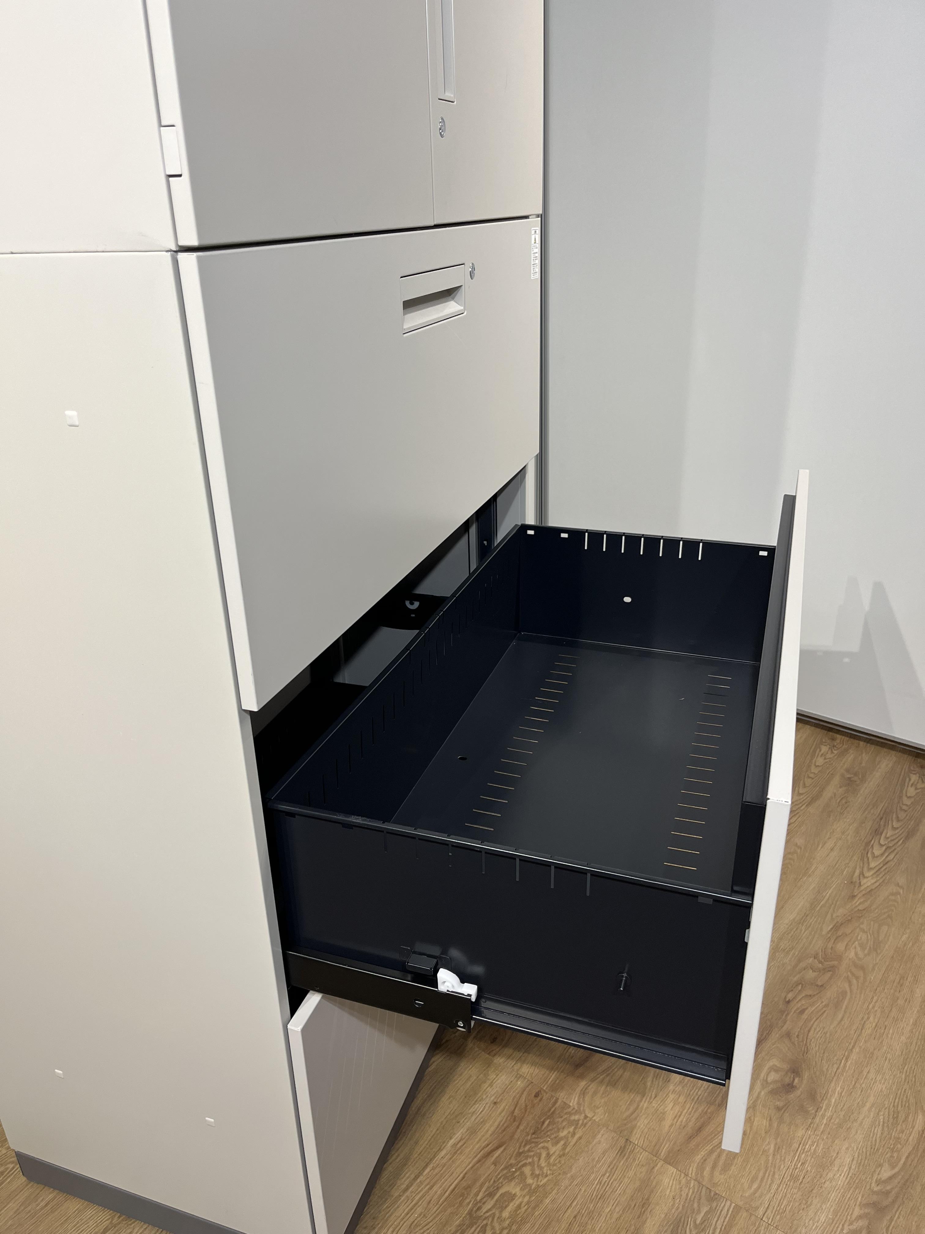 - 両開きタイプは扉が180度開き、通路の邪魔になりません。ラテラルタイプは引出しが限界まで出せ、出し入れ楽々。