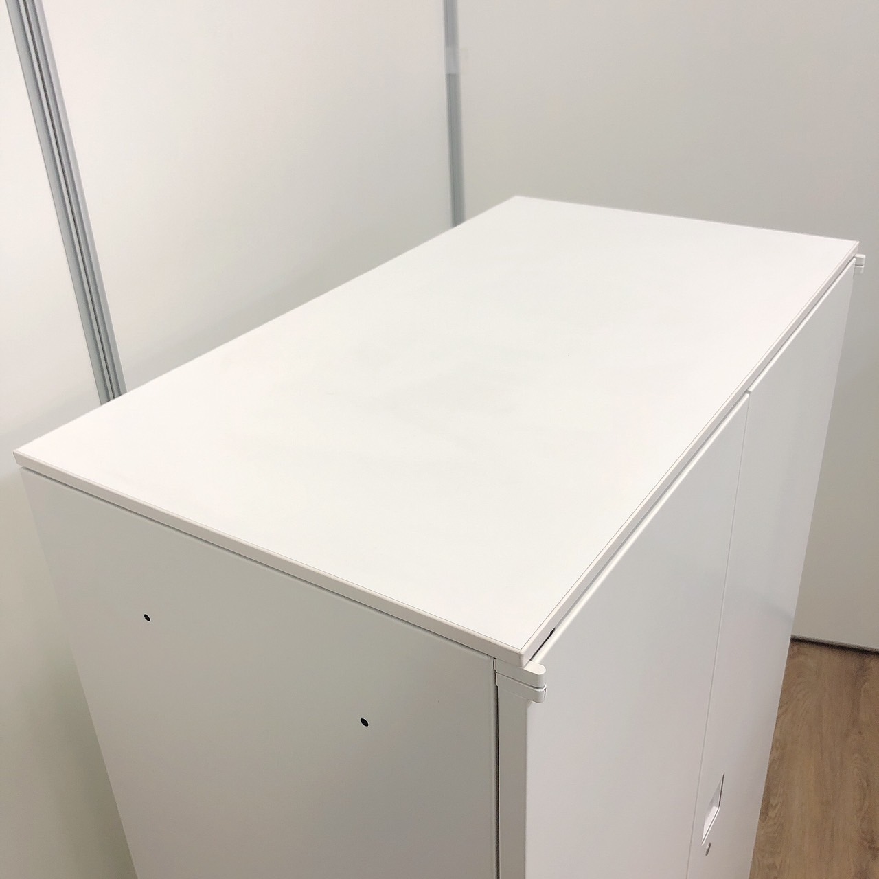 【オフィスの書類をスッキリ整理!取っ手がどの方向からでも開くマルチハンドル!】■オカムラ(okamura)製 レクトラインシリーズ 両開き書庫 ローキャビネット ■本体色:ホワイト ■シリンダー錠 ■ナチュラル天板付き