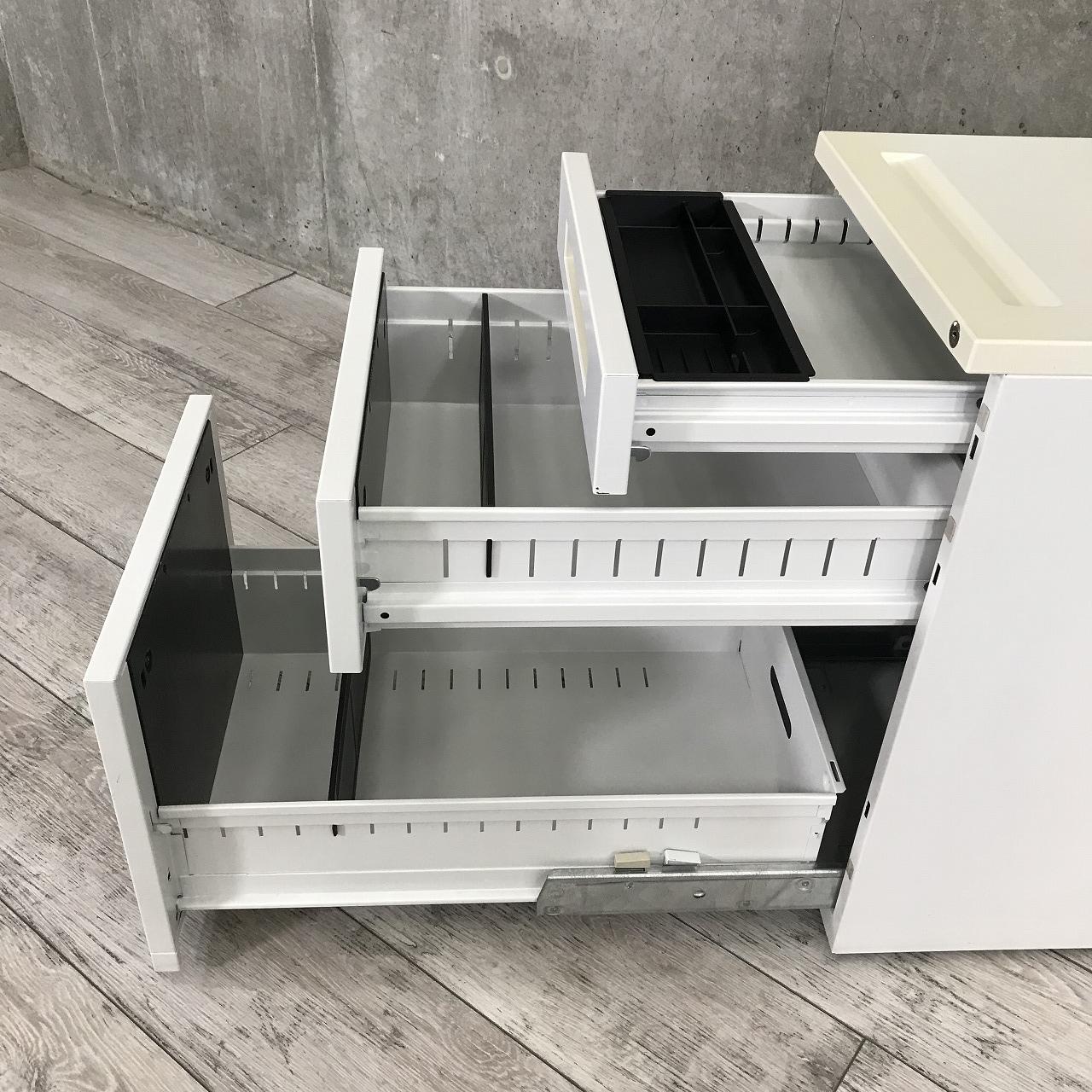 3段ともサイズの異なる引出しで、用途別に収納できます。