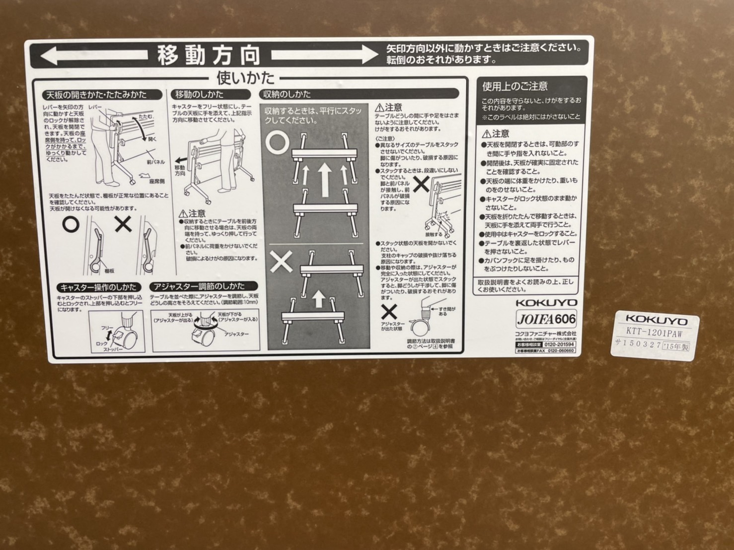 コクヨ製の収納性に優れた、平行スタッキングテーブルでございます。便利なキャスター付きで、天板折り畳みタイプです!