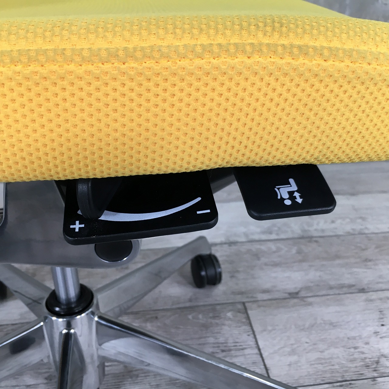 - あり黄ばみ・変色が広い範囲にうっすらある、または濃い黄ばみ・変色が一部ある。(例、座面・背もたれ、脚部等にある。)