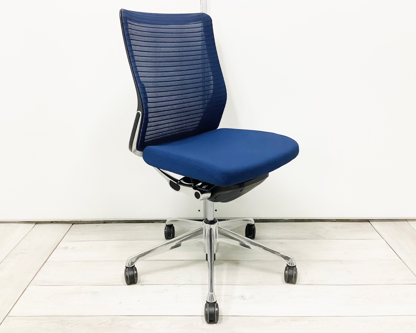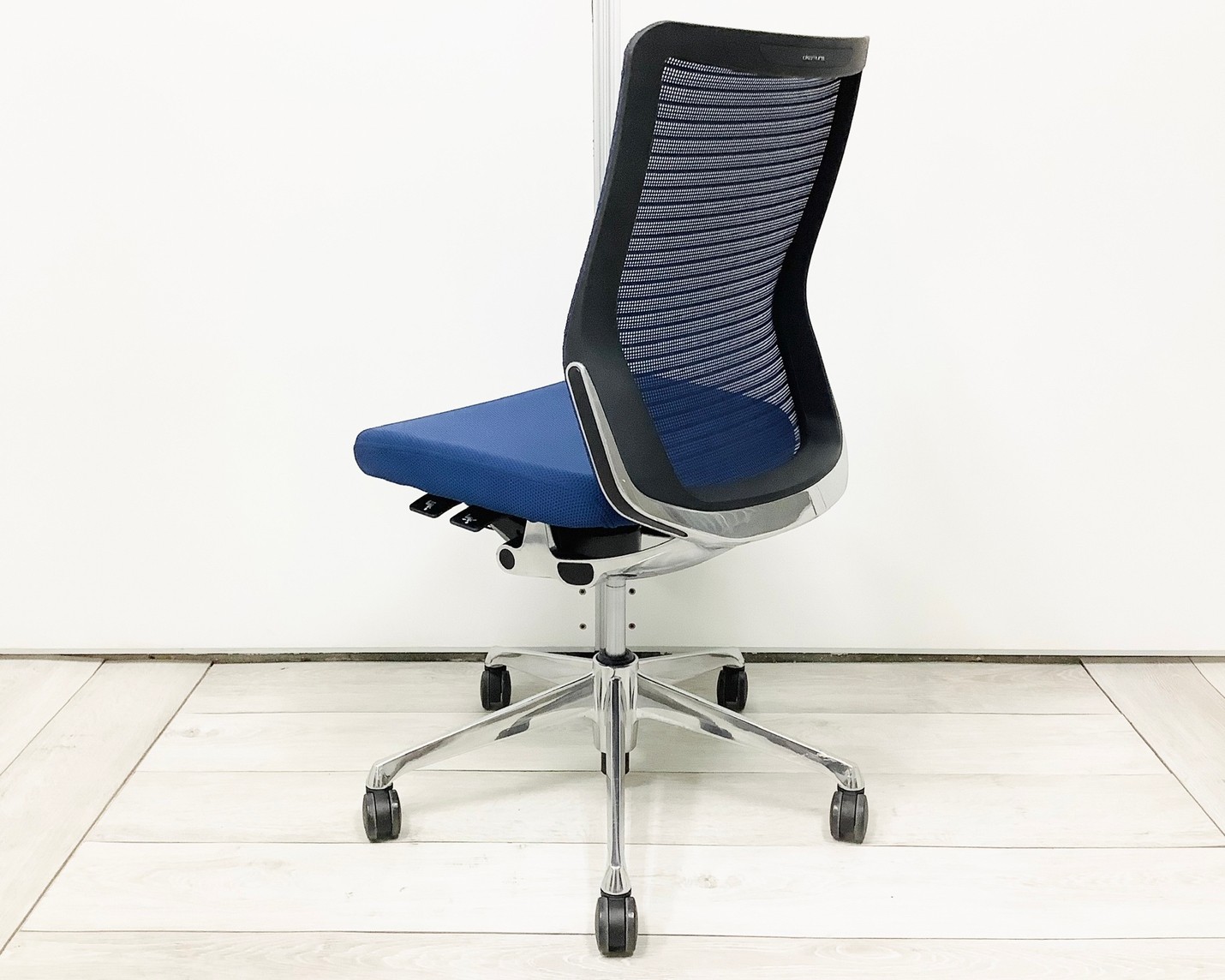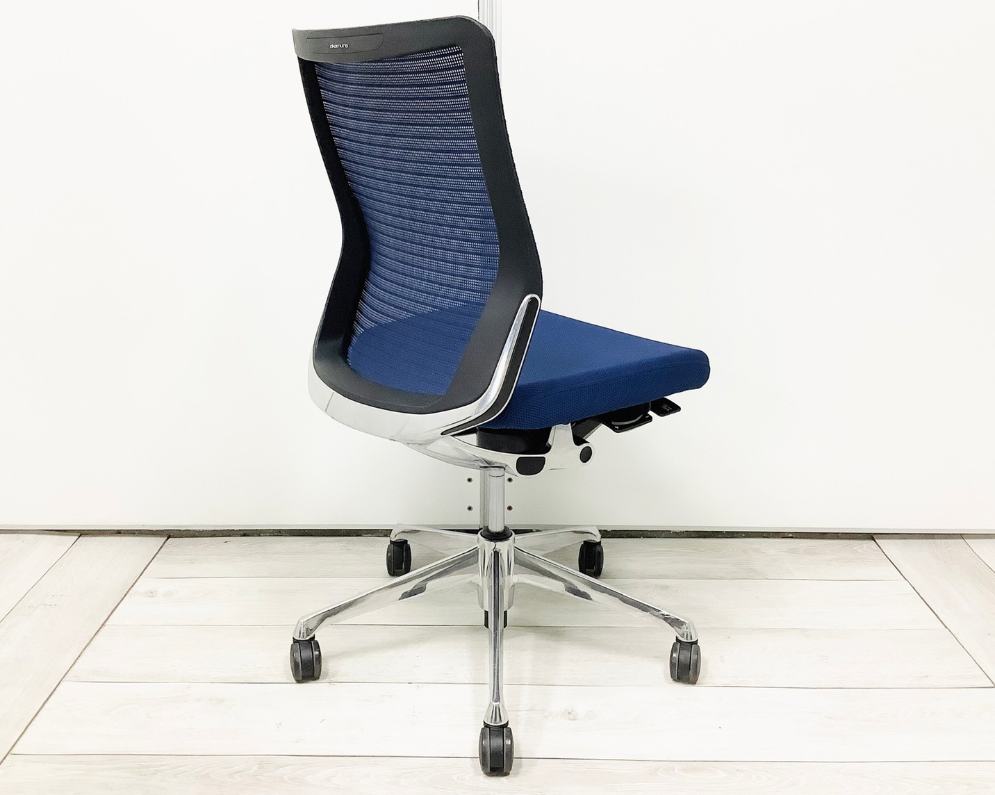 【機能性抜群の人気チェア!自然な姿勢をサポートするアンクルチルトリクライニング搭載!】■オカムラ(okamura)製 コーラルチェア(Choral) 肘無ミドルバックチェア 背面メッシュ ■ランバーサポート・コートハンガー付き ■ブルー×ブラックシェル