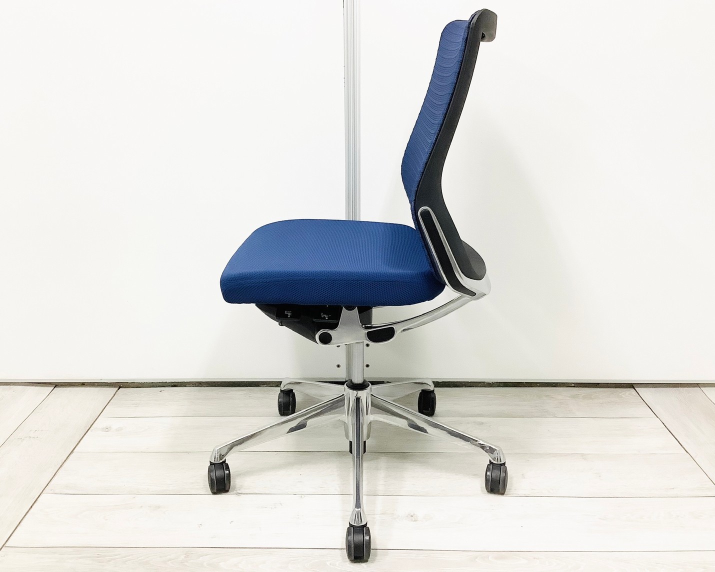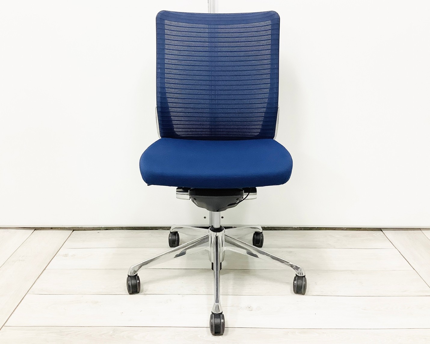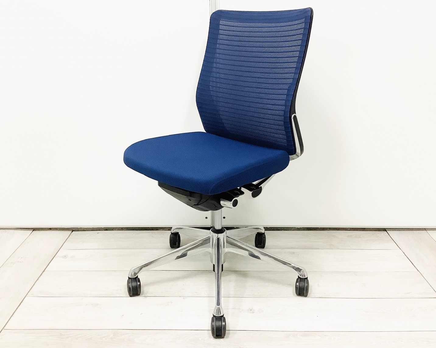 【機能性抜群の人気チェア!自然な姿勢をサポートするアンクルチルトリクライニング搭載!】■オカムラ(okamura)製 コーラルチェア(Choral) 肘無ミドルバックチェア 背面メッシュ ■ランバーサポート・コートハンガー付き ■ブルー×ブラックシェル