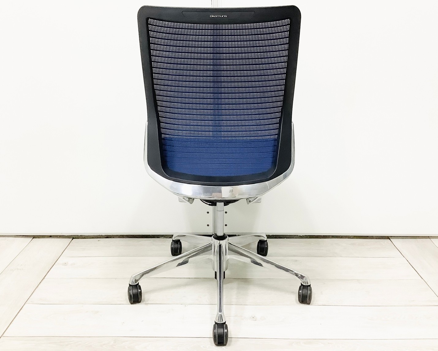 オカムラ コーラル 肘無しミドルバック メッシュタイプ 張地:ミディアムブルー シルバーフレーム ランバーサポート&コートハンガー付き