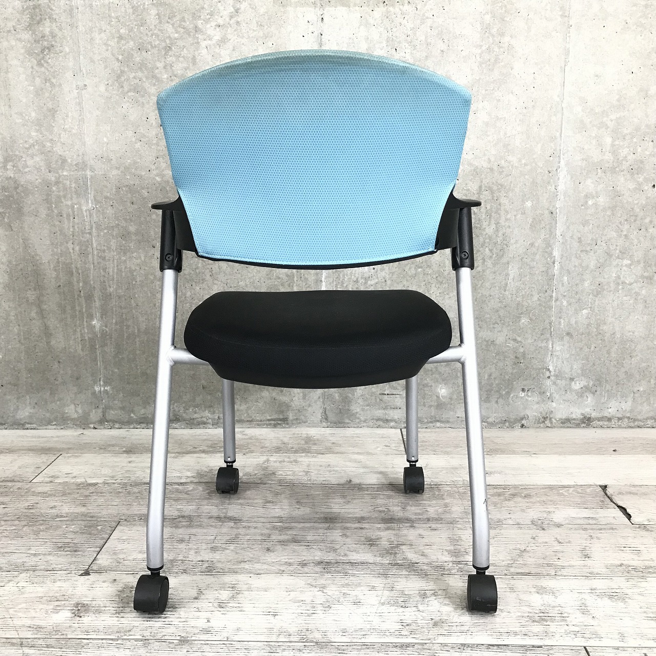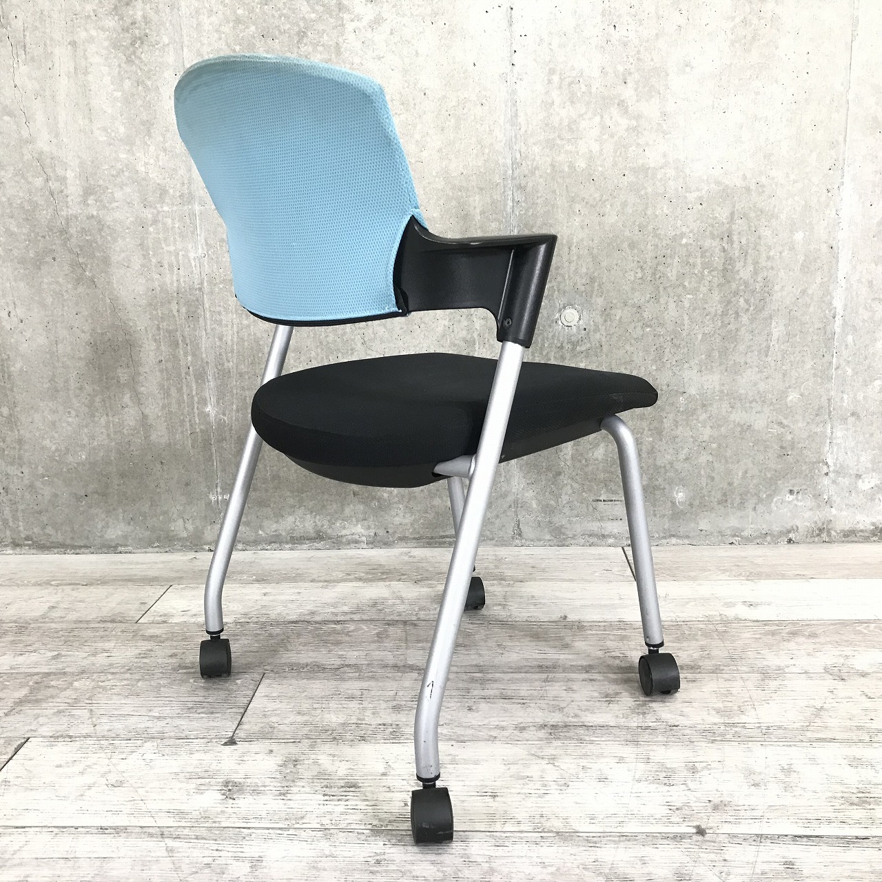 背もたれが鮮やかなライトブルー、座面がブラックのキャスター付きタイプとなります。