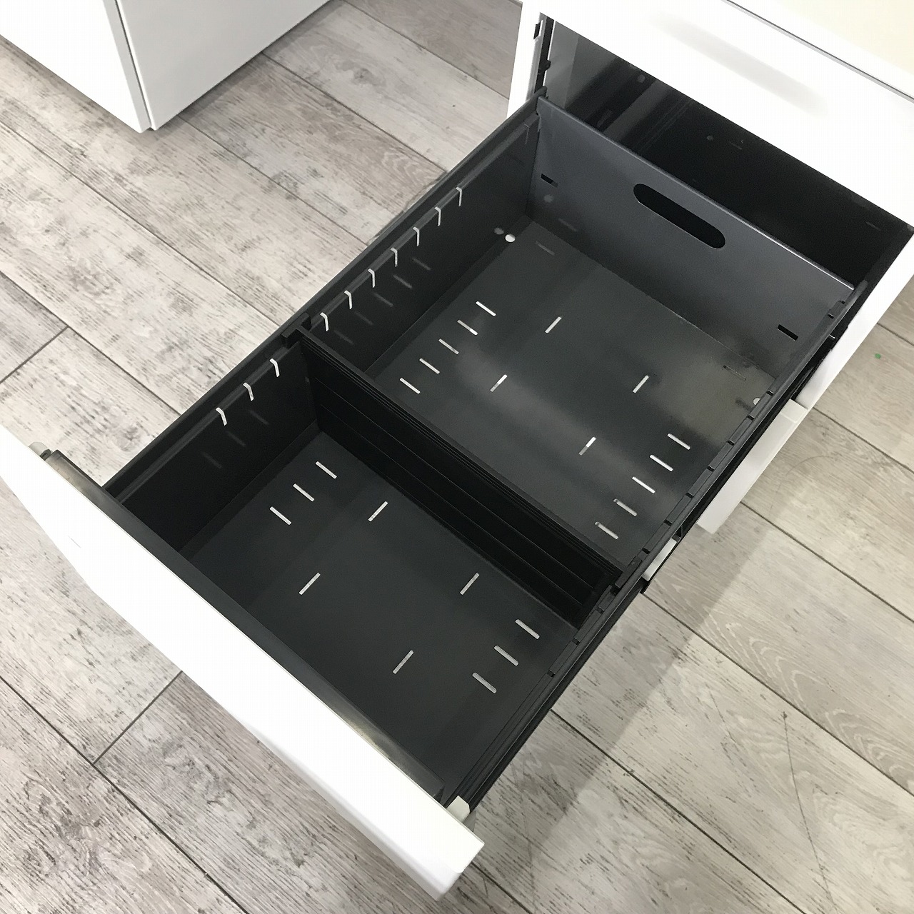 - 地震時、センター引出しが飛び出さないよう、ラッチ機構を装備。脚はデスクの横ズレを軽減させる設計になっています。