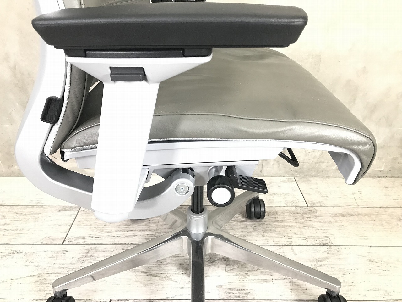 快適な座り心地に不可欠な調節機能である、上下昇降、座面の奥行き調整、リクライニングなどを備えており、操作もわかりやすく好評です。 特に、座面の奥行きは、座面下の左右に通った細いバーで調整でき、座ったままで軽やかに滑るように調整が可能です。 価格面では、新品では高めですが、中古は流通も多く、定価の3割前後の価格で高級チェアの座り心地を手に入れることができます!
