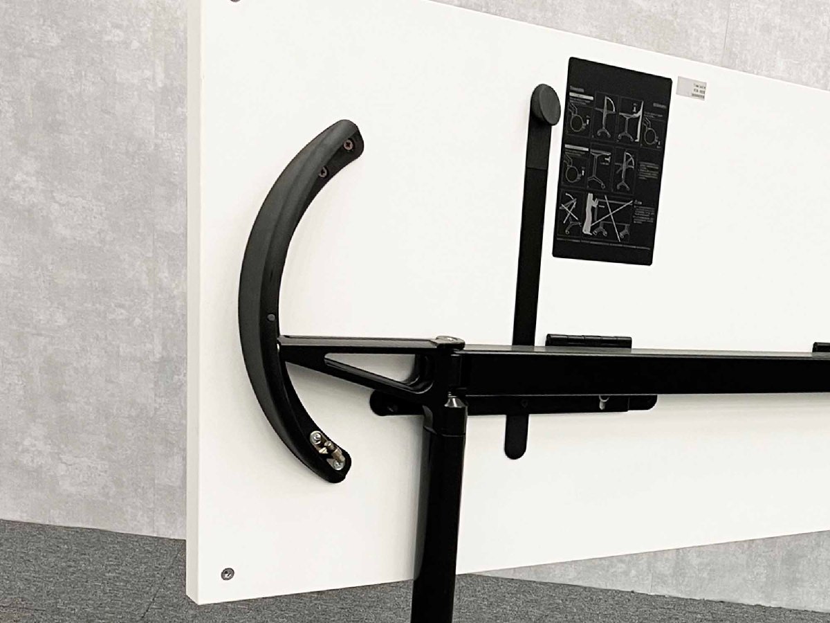 テーブルトップ下にある左右のレバーを手前に引きながら持ち上げるとロックが外れ、テーブルトップが90°回転して垂直になります。